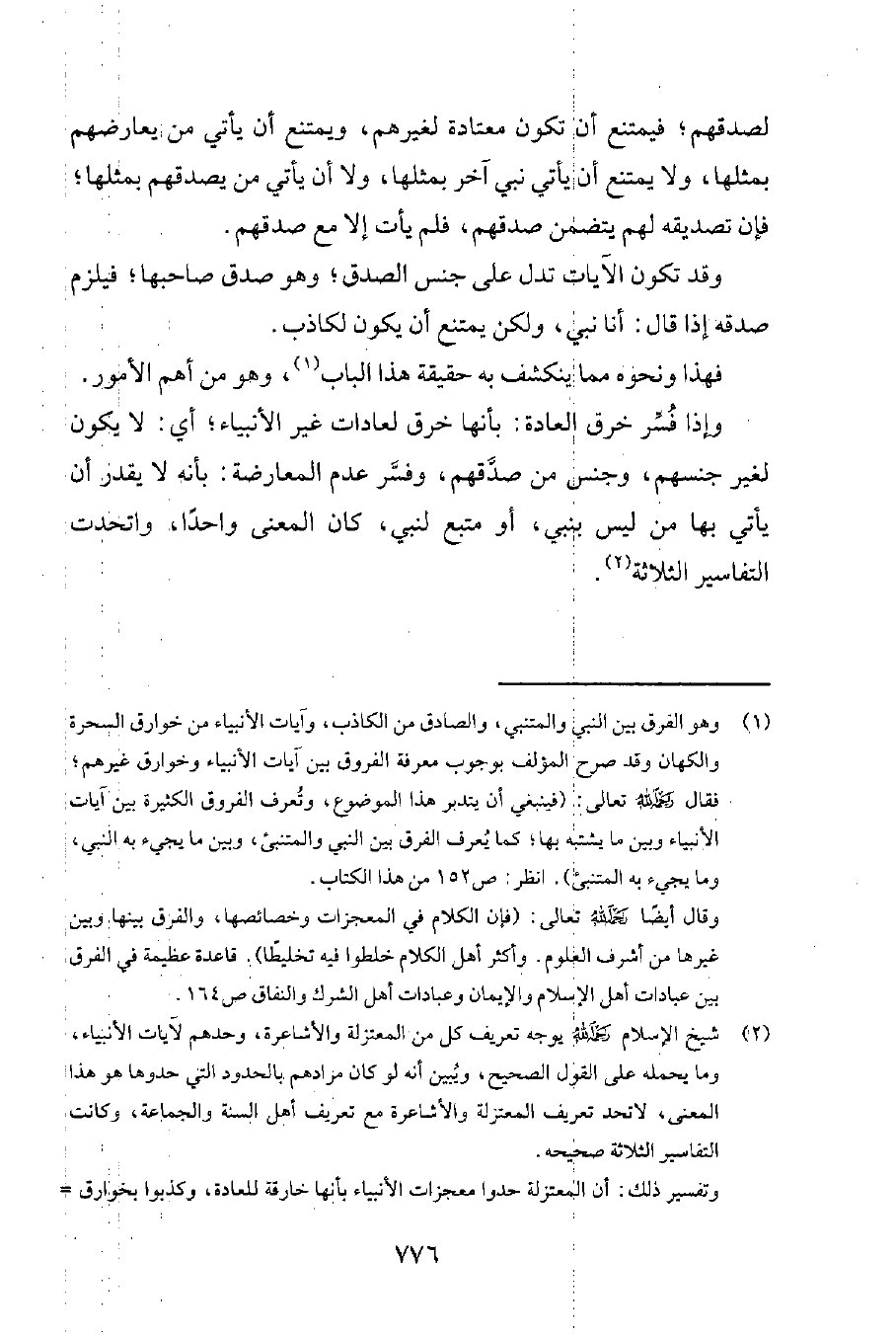 وإذا فُسِّر خرق العادة: بأنها خرق لعادات غير الأنبياء؛ أي لا يكون لغير جنسهم، وجنس من صدَّقهم، وفسَّر عدم المعارضة: بأنّه لا يقدر أن يأتي بها من ليس بنبيّ، أو متبع لنبي، كان المعنى واحداً، واتَّحدت التفاسير الثلاثة2.
