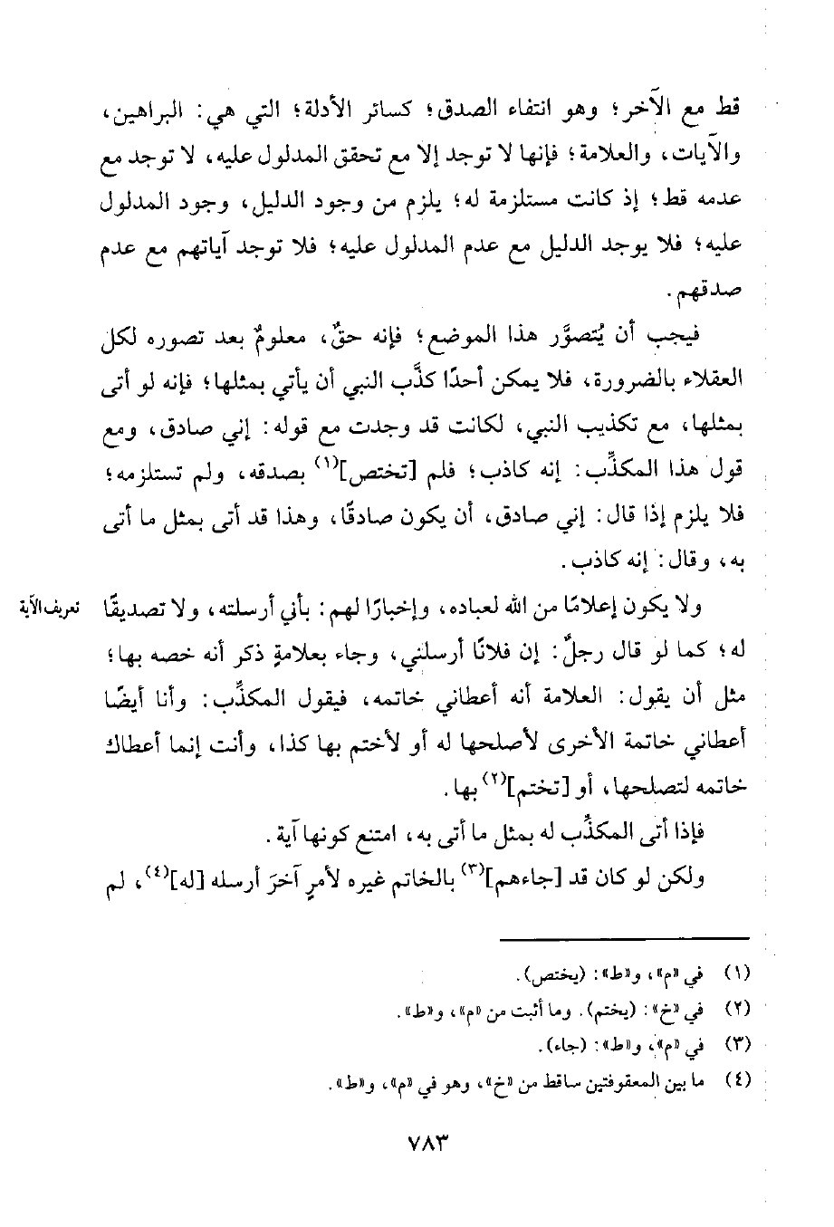 فيجب أن يُتصوَّر هذا الموضع؛ فإنّه حقٌ، معلومٌ بعد تصوّره لكل العقلاء بالضرورة، فلا يمكن أحداً كذَّب النبي أن يأتي بمثلها؛ فإنّه لو أتى بمثلها، مع تكذيب النبيّ، لكانت قد وجدت مع قوله: إنّي صادق، ومع قول هذا المكذِّب: إنّه كاذب؛ فلم [تختصّ] 1 بصدقه، ولم تستلزمه؛ فلا يلزم إذا قال: إني صادق، أن يكون صادقاً، وهذا قد أتى بمثل ما أتى به، وقال: إنّه كاذب.