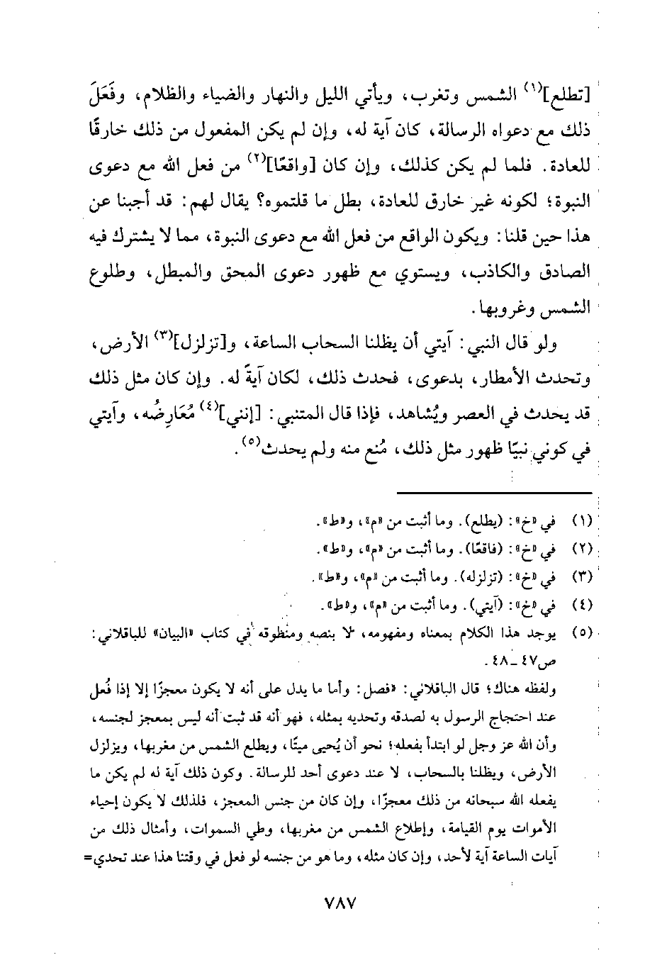 5 يُوجد هذا الكلام بمعناه ومفهومه، لا بنصه ومنطوقه في كتاب البيان للباقلاني ص 47-48.