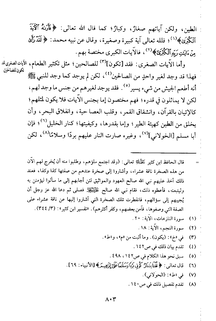وأما الآيات الصغرى: فقد [تكون] 3 للصالحين؛ مثل تكثير الطعام، فهذا قد وجد لغير واحدٍ من الصالحين4، لكن لم يوجد كما وجد للنبيّ صلى الله عليه وسلم أنّه أطعم الجيش من شيء يسير5. فقد يوجد لغيرهم من جنس ما وجد لهم، لكن لا يماثلون في قدره؛ فهم مختصون إمّا بجنس الآيات فلا يكون لمثلهم؛ كالاتيان بالقرآن، وانشقاق القمر، وقلب العصا حية، وانفلاق البحر، وأن يخلق من الطين كهيئة الطير؛ وإمّا بقدرها، وكيفيتها؛ كنار الخليل6؛ فإنّ أبا مسلم [الخولاني] 7، وغيره صارت النار عليهم برداً وسلاماً8، لكن
