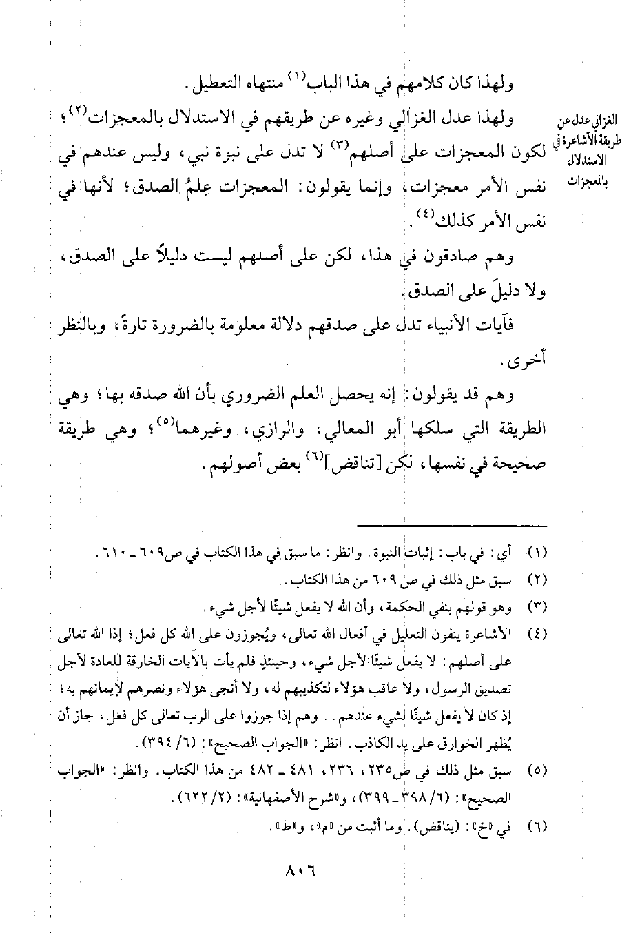 ولهذا عدل الغزالي وغيره عن طريقهم في الاستدلال بالمعجزات2؛ لكون المعجزات على أصلهم3 لا تدلّ على نبوة نبيّ. وليس عندهم في نفس الأمر معجزات، وإنما يقولون: المعجزات عِلمُ الصدق؛ لأنّها في نفس الأمر كذلك4.