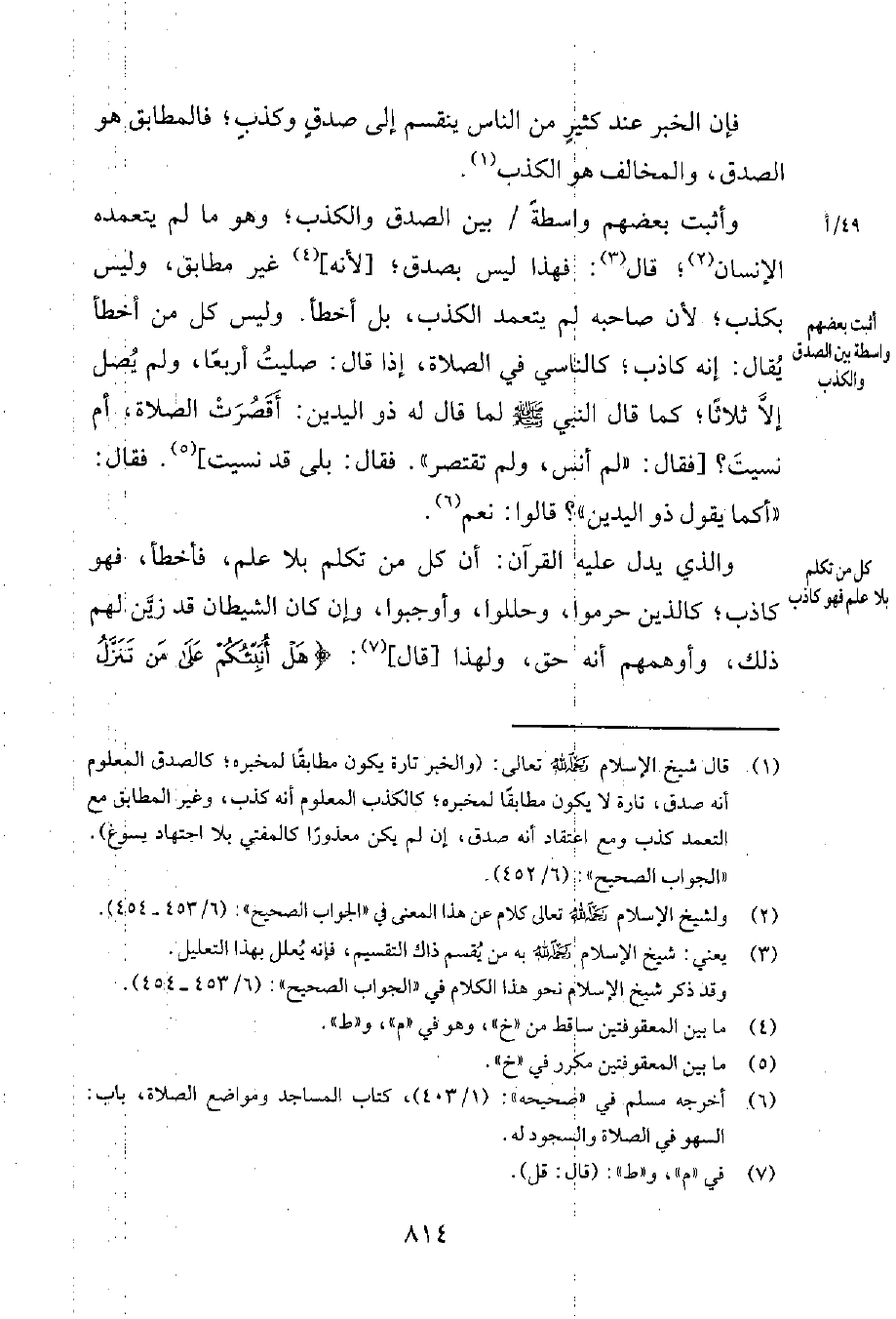 وأثبت بعضهم واسطةً بين الصدق والكذب؛ وهو ما لم يتعمّده الإنسان 2؛ قال 3: فهذا ليس بصدق؛ [لأنّه] 4 غير مطابق، وليس بكذب؛ لأنّ صاحبه لم يتعمّد الكذب، بل أخطأ. وليس كلّ من أخطأ يُقال: إنّه كاذب؛ كالناسي في الصلاة، إذا قال: صلّيتُ أربعاً، ولم يُصلّ إلاَّ ثلاثاً؛ كما قال النبي صلى الله عليه وسلم لما قال له ذو اليدين: أقُصِرَت الصلاة، أم نسيتَ؟ [فقال: "لم أنس، ولم تقتصر". فقال: بلى قد نسيت] 5. فقال: "أكما يقول ذو اليدين؟ " قالوا: نعم6.