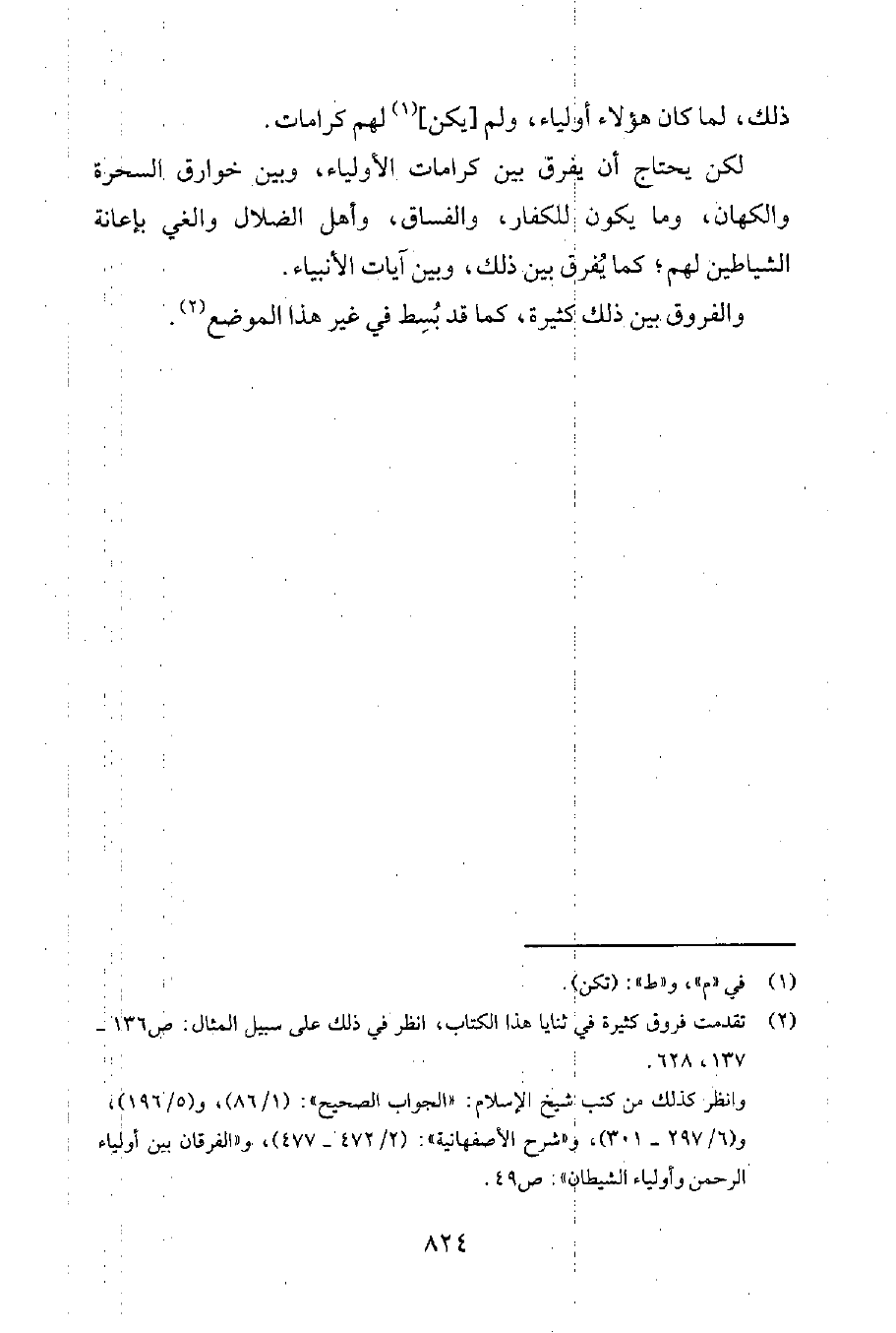 لكن يحتاج أن يفرق بين كرامات الأولياء، وبين خوارق السحرة والكهّان، وما يكون للكفّار، والفسّاق، وأهل الضلال والغي بإعانة الشياطين لهم؛ كما يُفرّق بين ذلك، وبين آيات الأنبياء.