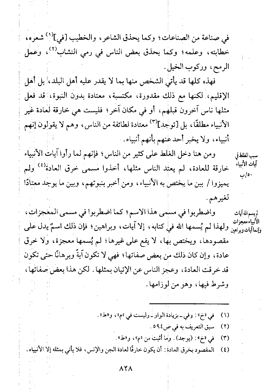 فهذه كلّها قد يأتي الشخص منها بما لا يقدر عليه أهل البلد، بل أهل الإقليم، لكنها مع ذلك مقدورة، مكتسبة، معتادة بدون النبوة، قد فعل مثلها ناس آخرون قبلهم، أو في مكان أخر؛ فليست هي خارقة لعادة غير الأنبياء مطلقاً، بل [توجد] 3 معتادة لطائفة من الناس، وهم لا يقولون إنّهم أنبياء، ولا يخبر أحد عنهم بأنهم أنبياء.