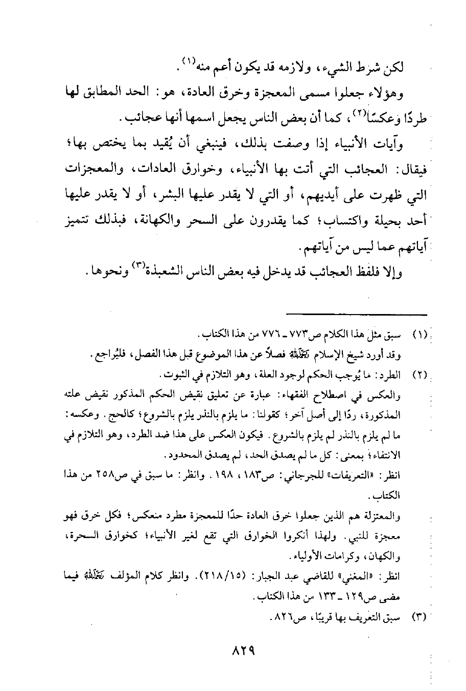 والمعتزلة هم الذين جعلوا خرق العادة حدّاً للمعجزة مطّرد منعكس؛ فكلّ خرق فهو معجزة للنبي. ولهذا أنكروا الخوارق التي تقع لغير الأنبياء؛ كخوارق السحرة، والكهان، وكرامات الأولياء. انظر: المغني للقاضي عبد الجبار 15218. وانظر كلام المؤلف رحمه الله فيما مضى ص 147-152 من هذا الكتاب.