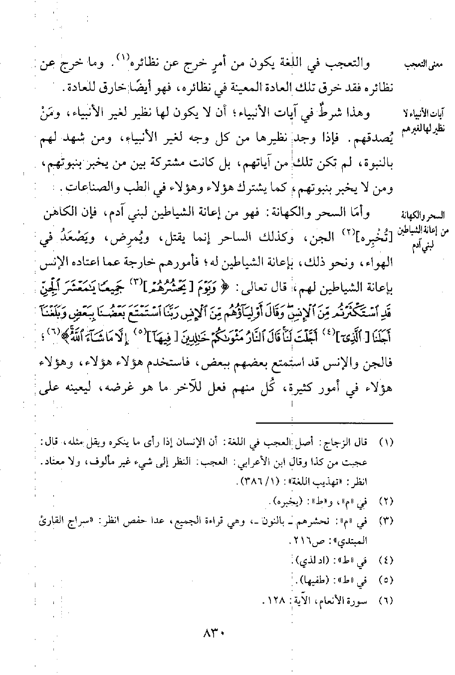 وأمّا السحر والكهانة: فهو من إعانة الشياطين لبني آدم، فإنّ الكاهن [تُخْبِره] 2 الجن، وكذلك الساحر إنما يُقتل، ويُمرِض، ويَصْعَدُ في الهواء، ونحو ذلك، بإعانة الشياطين له؛ فأمورهم خارجة عما اعتاده الإنس بإعانة الشياطين لهم، قال تعالى: {وَيَوْمَ [يَحْشُرُهُمْ] 3 جَمِيعَاً يَا مَعْشَرَ الجِنِّ قَد اسْتَكْثَرْتُمْ مِنَ الإِنْسِ وَقَال أَوْلِيَاؤُهُمْ مِنَ الإِنْسِ رَبَّنَا اسْتَمْتَعَ بَعْضُنَا بِبَعْضٍ وَبَلَغْنَا أَجَلَنَا [الَّذِي] 4 أَجَّلْتَ لَنَا قَالَ النارُ مَثْوَاكُمْ خالِدِينَ [فِيهَا] 5 إِلاَّ مَا شَاءَ اللهُ} 6؛ فالجن والإنس قد استمتع بعضهم ببعض, فاستخدم هؤلاء هؤلاء، وهؤلاء هؤلاء في أمور كثيرة، كُلّ منهم فعل للآخر ما هو غرضه، ليعينه على
