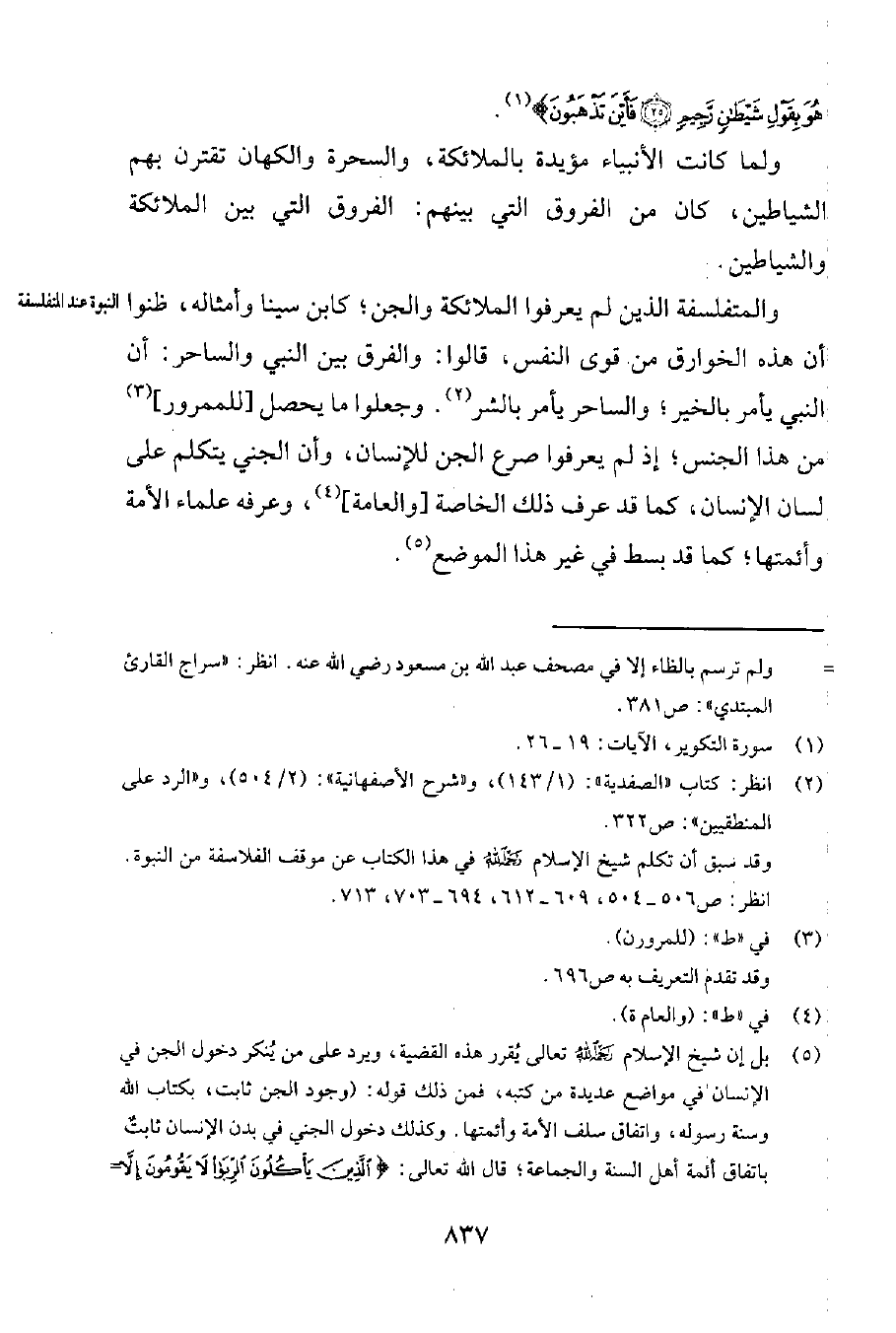والمتفلسفة الذين لم يعرفوا الملائكة والجن؛ كابن سينا وأمثاله، ظنّوا أنّ هذه الخوارق من قوى النفس، قالوا: والفرق بين النبيّ والساحر: أنّ النبيّ يأمر بالخير، والساحر يأمر بالشر2. وجعلوا ما يحصل [للممرور] 3 من هذا الجنس؛ إذ لم يعرفوا صرع الجنّ للإنسان، وأنّ الجني يتكلم على لسان الإنسان، كما قد عرف ذلك الخاصة [والعامة] 4، وعرفه علماء الأمة وأئمتها؛ كما قد بسط في غير هذا الموضع5.