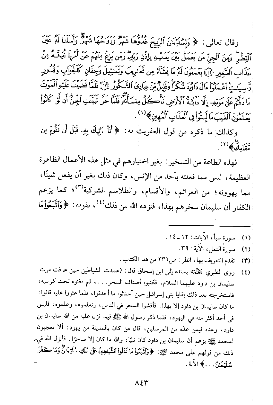 فهذه الطاعة من التسخير: بغير اختيارهم في مثل هذه الأعمال الظاهرة العظيمة، ليس مما فعلته بأحد من الإنس، وكان ذلك بغير أن يفعل شيئاً، مما يهوونه؛ من العزائم، والأقسام، والطلاسم الشركية3؛ كما يزعم الكفار أنّ سليمان سخّرهم بهذا، فنزّهه الله من ذلك4، بقوله: {وَاتَّبَعُوا مَا
