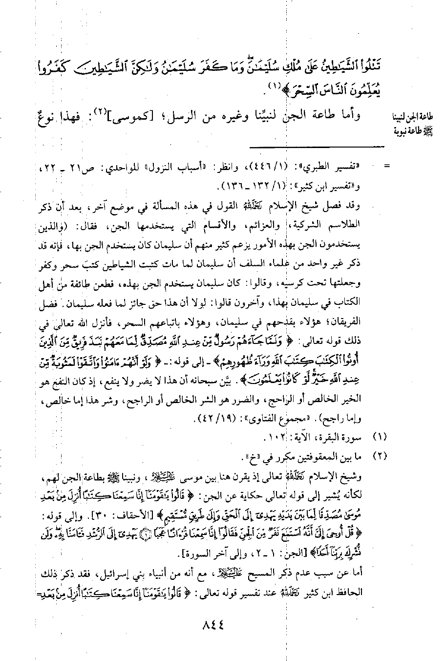 وشيخ الإسلام رحمه الله تعالى إذ يقرن هنا بين موسى عليه السلام، ونبيّنا صلى الله عليه وسلم بطاعة الجنّ لهم، لكأنه يُشير إلى قوله تعالى حكاية عن الجنّ: {قَالُوا يَا قَوْمَنَا إِنَّا سَمِعْنَا كِتَاباً أُنْزِلَ مِنْ بَعْدِ مُوسَى مُصَدِّقاً لِمَا بَيْنَ يَدَيْهِ يَهْدِي إِلَى الْحَقِّ وَإِلَى طَرِيقٍ مُسْتَقِيمٍ} [سورة الأحقاف، الآية 30] . وإلى قوله: {قُلْ أُوحِيَ إِلَيَّ أَنَّهُ اسْتَمَعَ نَفَرٌ مِنَ الْجِنِّ فَقَالُوا إِنَّا سَمِعْنَا قُرْآناً عَجَباً يَهْدِي إِلَى الرُّشْدِ فَآمَنَّا بِهِ وَلَنْ نُشْرِكَ بِرَبِّنَا أَحَداً} [سورة الجن، الآيتان 1-2، وإلى لآخر السورة] .