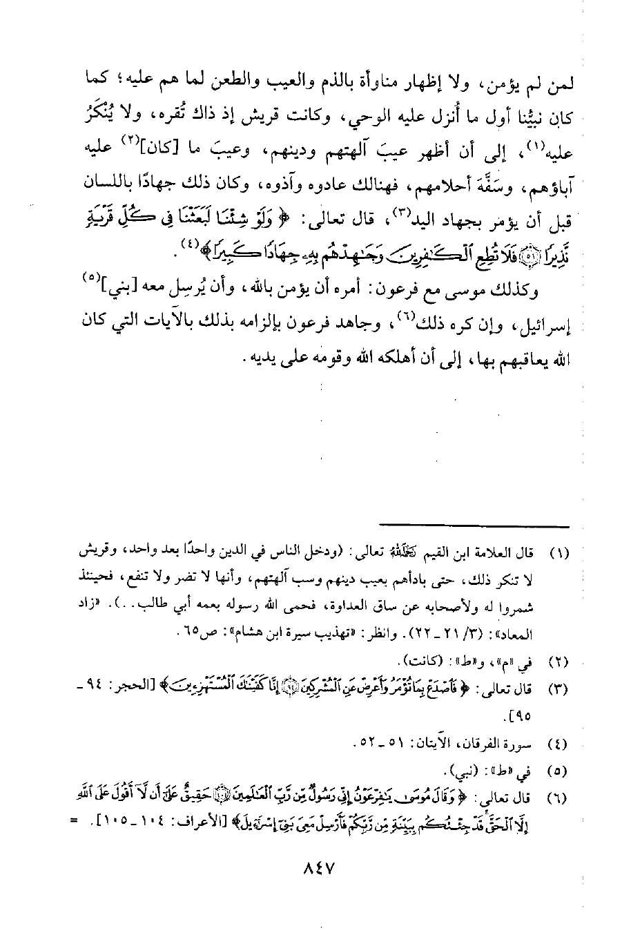 لمن لم يؤمن، ولا إظهار مناوأة بالذم والعيب والطعن لما هم عليه؛ كما كان نبيُّنا أول ما أُنزل عليه الوحي، وكانت قريش إذ ذاك تُقرّه، ولا يُنْكَرُ عليه1، إلى أن أظهر عيبَ آلهتهم ودينهم، وعيبَ ما [كان] 2 عليه آباؤهم، وسَفَّهَ أحلامهم، فهنالك عادوه وآذوه، وكان ذلك جهاداً باللسان قبل أن يؤمر بجهاد اليد3، قال تعالى: {وَلَوْ شِئْنَا لَبَعَثْنَا في كُلِّ قَرْيَةٍ نَذِيراً فَلا تُطِعِ الكَافِرِينَ وَجَاهِدْهُمْ بِهِ جِهَادَاً كَبِيراً} 4.