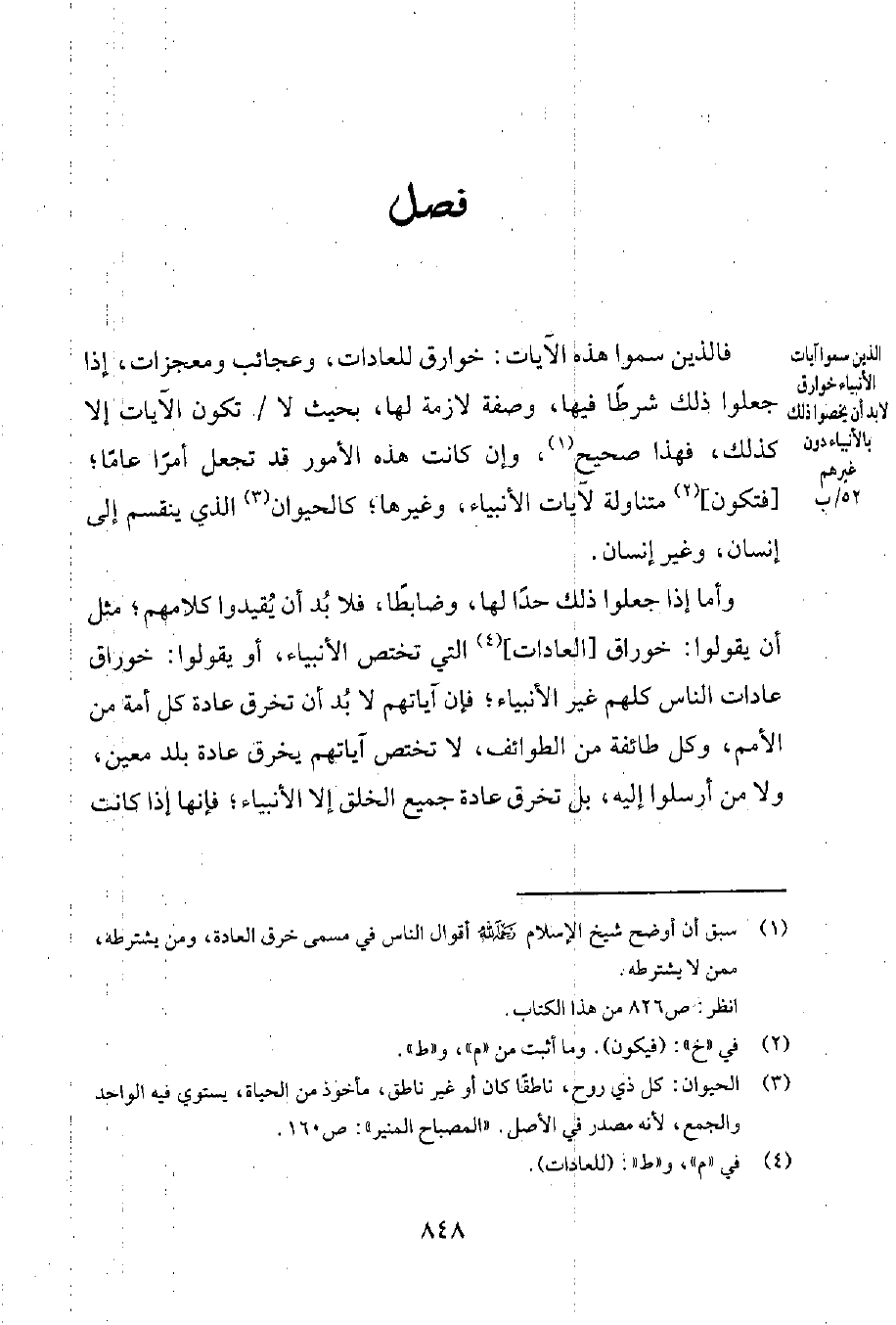 وأما إذا جعلوا ذلك حدّاً لها، وضابطاً، فلا بُدّ أن يُقيّدوا كلامهم؛ مثل أن يقولوا: خوارق [العادات] 4 التي تختص الأنبياء، أو يقولوا: خوارق عادات الناس كلّهم غير الأنبياء؛ فإن آياتهم لا بد أن تخرق عادة كلّ أمة من الأمم، وكل طائفة من الطوائف، لا تختص آياتهم يخرق عادة بلد معين، ولا من أرسلوا إليه، بل تخرق عادة جميع الخلق إلا الأنبياء؛ فإنها إذا كانت