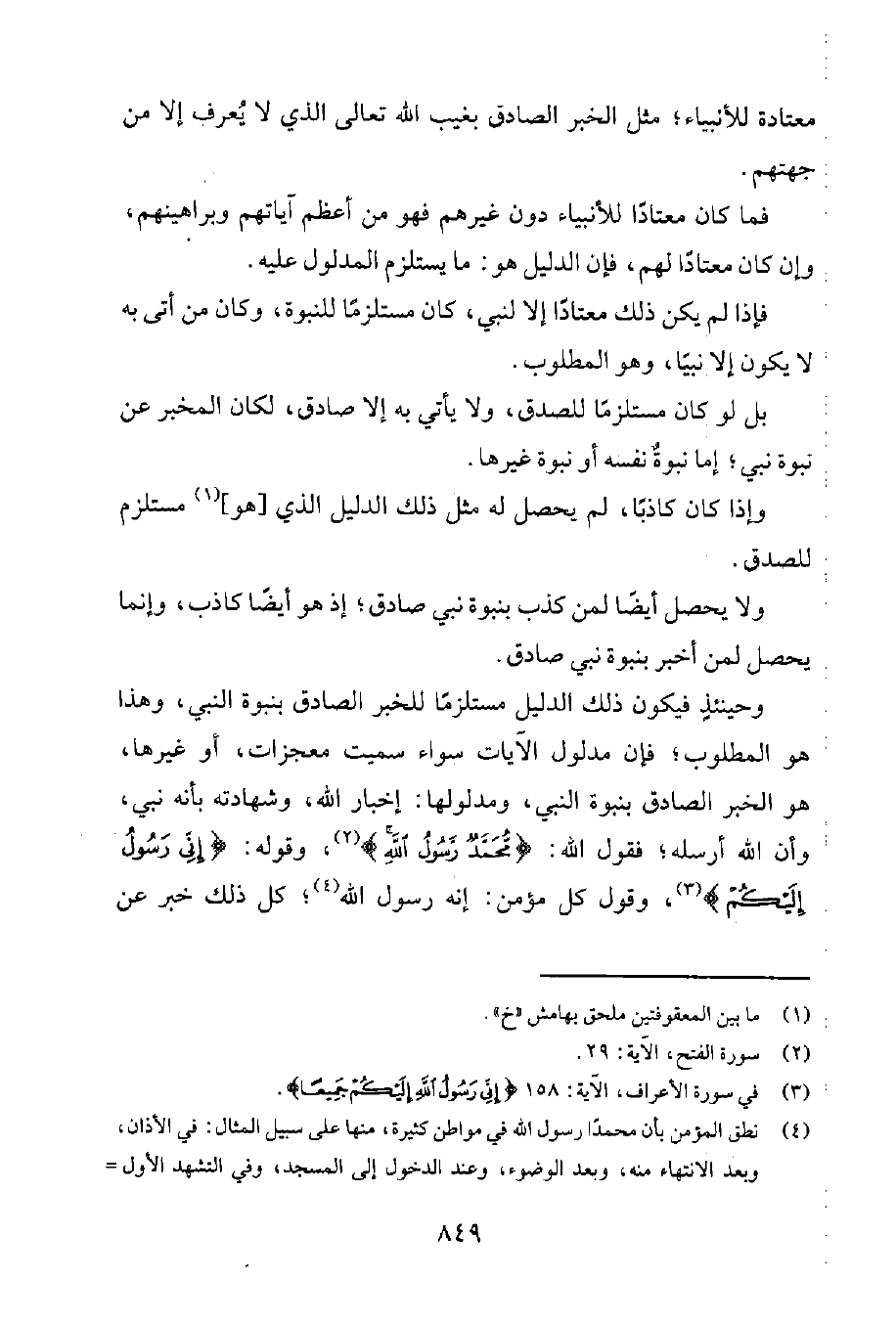 وحينئذٍ فيكون ذلك الدليل مستلزماً للخبر الصادق بنبوّة النبي، وهذا هو المطلوب؛ فإن مدلول الآيات سواء سميت معجزات، أو غيرها، والخبر الصادق بنبوة النبي، ومدلولها: إخبار الله، وشهادته بأنه نبي، وأنّ الله أرسله؛ فقول الله: {محمّد رسول الله} 2، وقوله: {إِنِّي رَسُولُ اللَّهِ إِلَيْكُمْ} 3، وقول كل مؤمن: إنه رسول الله4؛ كلّ ذلك خبرٌ عن