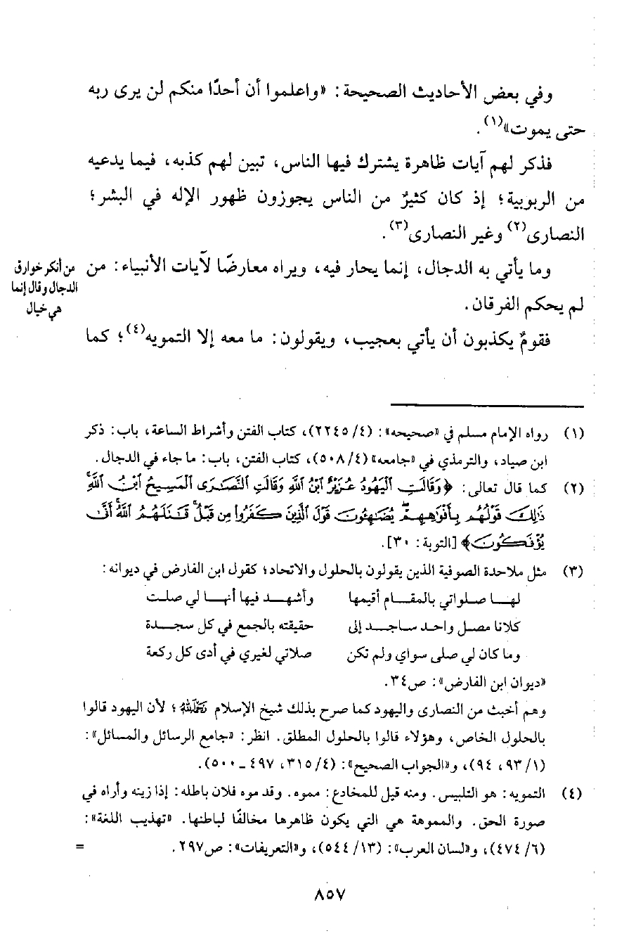 3 مثل ملاحدة الصوفية الذين يقولون بالحلول والاتحاد؛ كقول ابن الفارض في ديوانه: