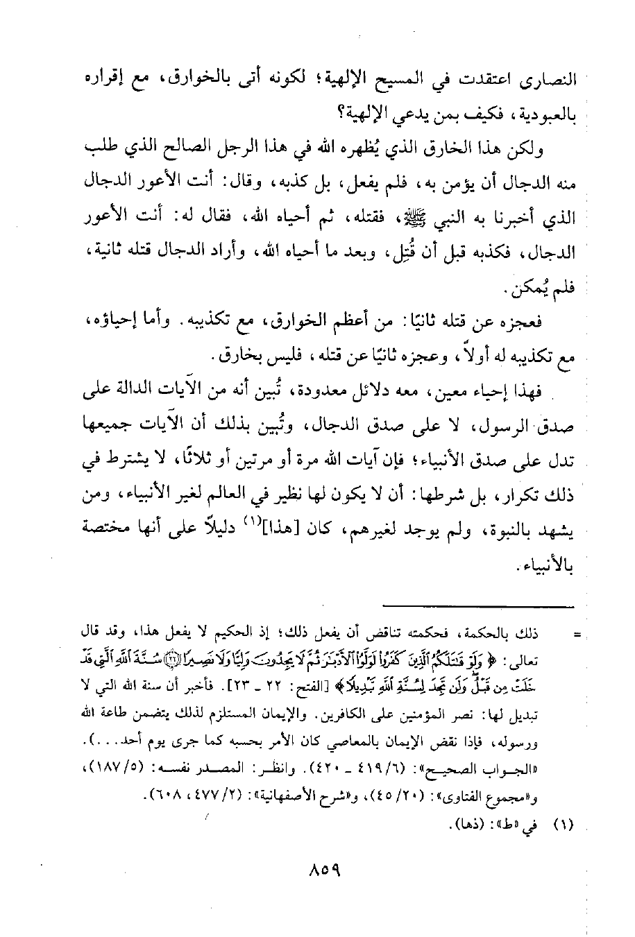 فهذا إحياء معين، معه دلائل معدودة، تُبيّن أنّه من الآيات الدالة على صدق الرسول، لا على صدق الدجال، وتُبيّن بذلك أنّ الآيات جميعها تدلّ على صدق الأنبياء؛ فإنّ آيات الله مرة أو مرتين أو ثلاثاً، لا يشترط في ذلك تكرار، بل شرطها: أن لا يكون لها نظير في العالم لغير الأنبياء، ومن يشهد بالنبوة، ولم يوجد لغيرهم، كان [هذا] 1 دليلاً على أنّها مختصة بالأنبياء.