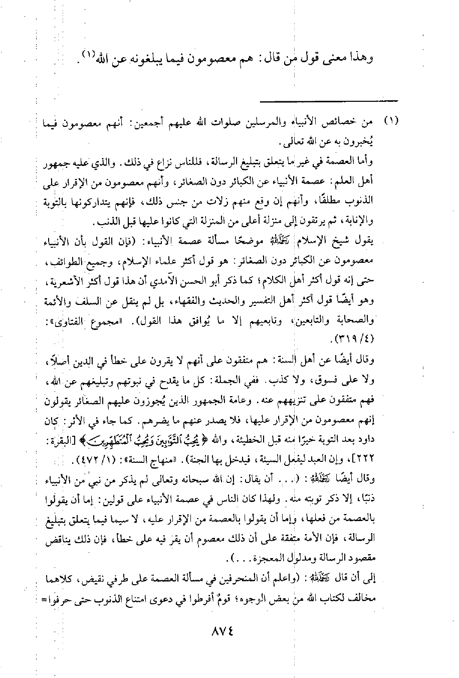 يقول شيخ الإسلام رحمه الله موضحاً مسألة عصمة الأنبياء: "فإنّ القول بأن الأنبياء معصومون عن الكبائر دون الصغائر: هو قول أكثر علماء الإسلام، وجميع الطوائف، حتى إنه قول أكثر أهل الكلام؛ كما ذكر أبو الحسن الآمدي أنّ هذا قول أكثر الأشعرية، وهو أيضاً قول أكثر أهل التفسير والحديث والفقهاء، بل لم ينقل عن السلف والأئمة والصحابة والتابعين وتابعيهم إلا ما يُوافق هذا القول". مجموع الفتاوى 4319.