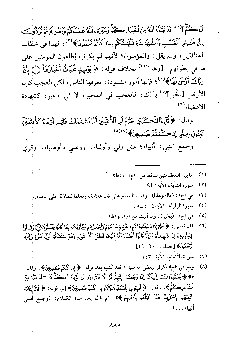 لَكُمْ] 1 قَدْ نَبَّأَنَا اللهُ مِنْ أَخْبَارِكُمْ وَسَيَرَى اللهُ عَمَلَكُمْ وَرَسُولُهُ ثُمَّ تُرَدُّونَ إِلَى عَالِمِ الغَيْبِ وَالشَّهَادَةِ فَيُنَبِّئُكُمْ بِمَا كُنْتُمْ تَعْمَلُونَ} 2؛ فهذا في خطاب المنافقين، ولم يقل: والمؤمنون؛ لأنهم لم يكونوا يُطلِعون المؤمنين على ما في بطونهم. [وهذا] 3 بخلاف قوله: {يَؤْمَئِذٍ تُحَدِّثُ أَخْبَارَهَا بِأَنَّ رَبَّكَ أَوْحَى لَهَا} 4؛ فإنها أمور مشهودة، يعرفها الناس، لكن العجب كون الأرض [تُخبر] 5 بذلك، فالعجب في المخبر، لا في الخبر؛ كشهادة الأعضاء6.