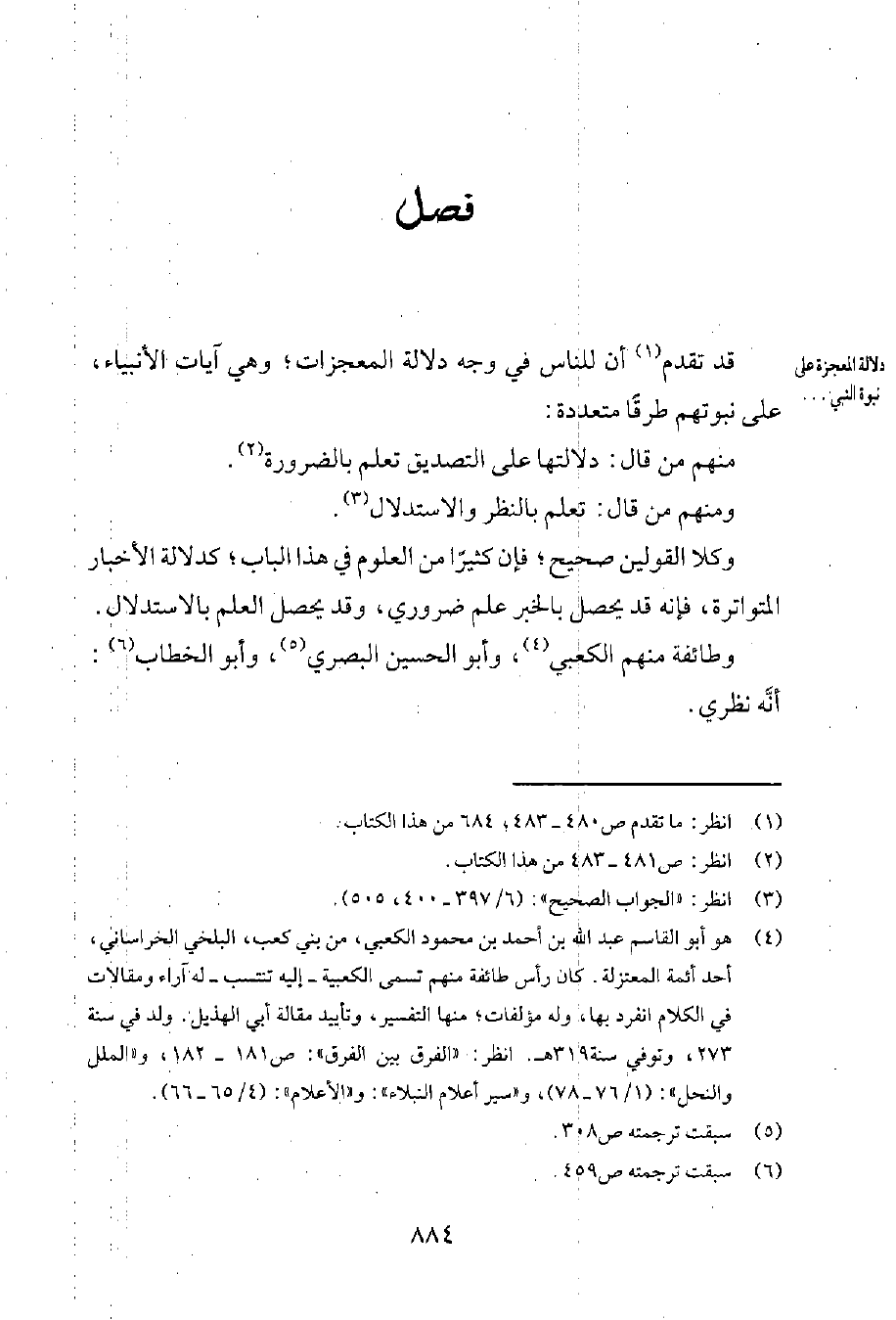 4 هو أبو القاسم عبد الله بن أحمد بن محمود الكعبي، من بني كعب، البلخي الخراساني، أحد أئمة المعتزلة. كان رأس طائفة منهم تسمى الكعبية - إليه تنتسب، له آراء ومقالات في الكلام انفرد بها، وله مؤلفات؛ منها التفسير، وتأييد مقالة أبي الهذيل. ولد في سنة 273، وتوفي سنة 319 ?.