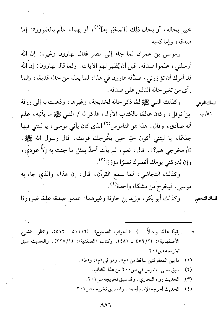 وكذلك النبيّ صلى الله عليه وسلم لمَّا ذكر حاله لخديجة، وغيرها، وذهبت به إلى ورقة بن نوفل، وكان عالماً بالكتاب الأول، فذكر له النبيّ صلى الله عليه وسلم ما يأتيه، علم أنّه صادق، وقال: هذا هو النَّاموس2 الذي كان يأتي موسى، يا ليتني فيها جذعاً، يا ليتني أكون حيّاً حين يُخرجك قومك. قال رسول الله صلى الله عليه وسلم: " أو مخرجيّ هم؟ ". قال: نعم، لم يأت أحدٌ بمثل ما جئت به إلاَّ عودي، وإن يُدركني يومك أنصرك نصراً مؤزّراً3.