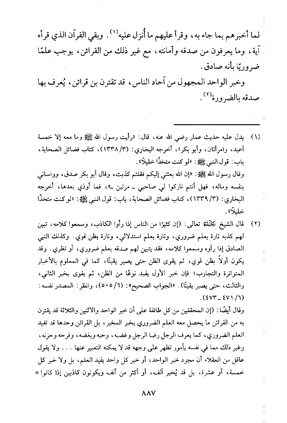 وخبر الواحد المجهول من آحاد الناس، قد تقترن به قرائن، يُعرف بها صدقه بالضرورة2.