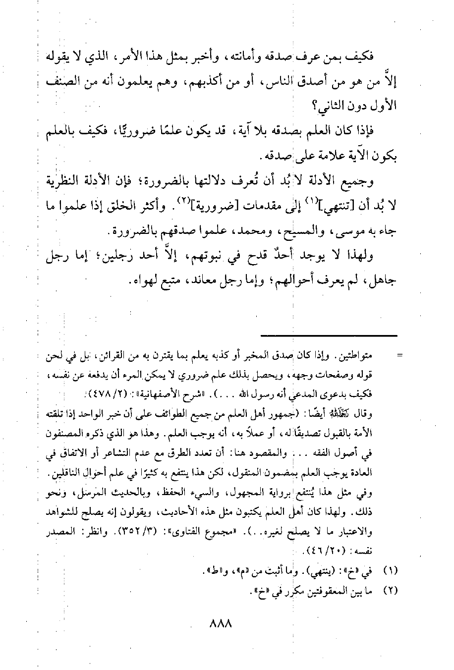 وجميع الأدلة لا بُدّ أن تُعرف دلالتها بالضرورة؛ فإنّ الأدلة النظرية لا بُدّ أن [تنتهي] 1 إلى مقدمات [ضرورية] 2. وأكثر الخلق إذا علموا ما جاء به موسى، والمسيح، ومحمد، علموا صدقهم بالضرورة.