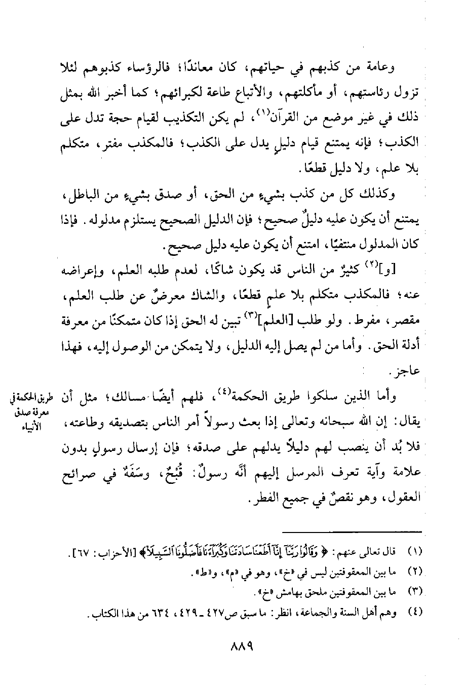 وأمّا الذين سلكوا طريق الحكمة4، فلهم أيضاً مسالك؛ مثل أن يقال: إنّ الله سبحانه وتعالى إذا بعث رسولاً أمر الناس بتصديقه وطاعته، فلا بُدّ أن ينصب لهم دليلاً يدلّهم على صدقه؛ فإنّ إرسال رسولٍ بدون علامة وآية تعرف المرسل إليهم أنَّه رسولٌ: قُبْحٌ، وسَفَهٌ في صرائح العقول، وهو نقصٌ في جميع الفطر.