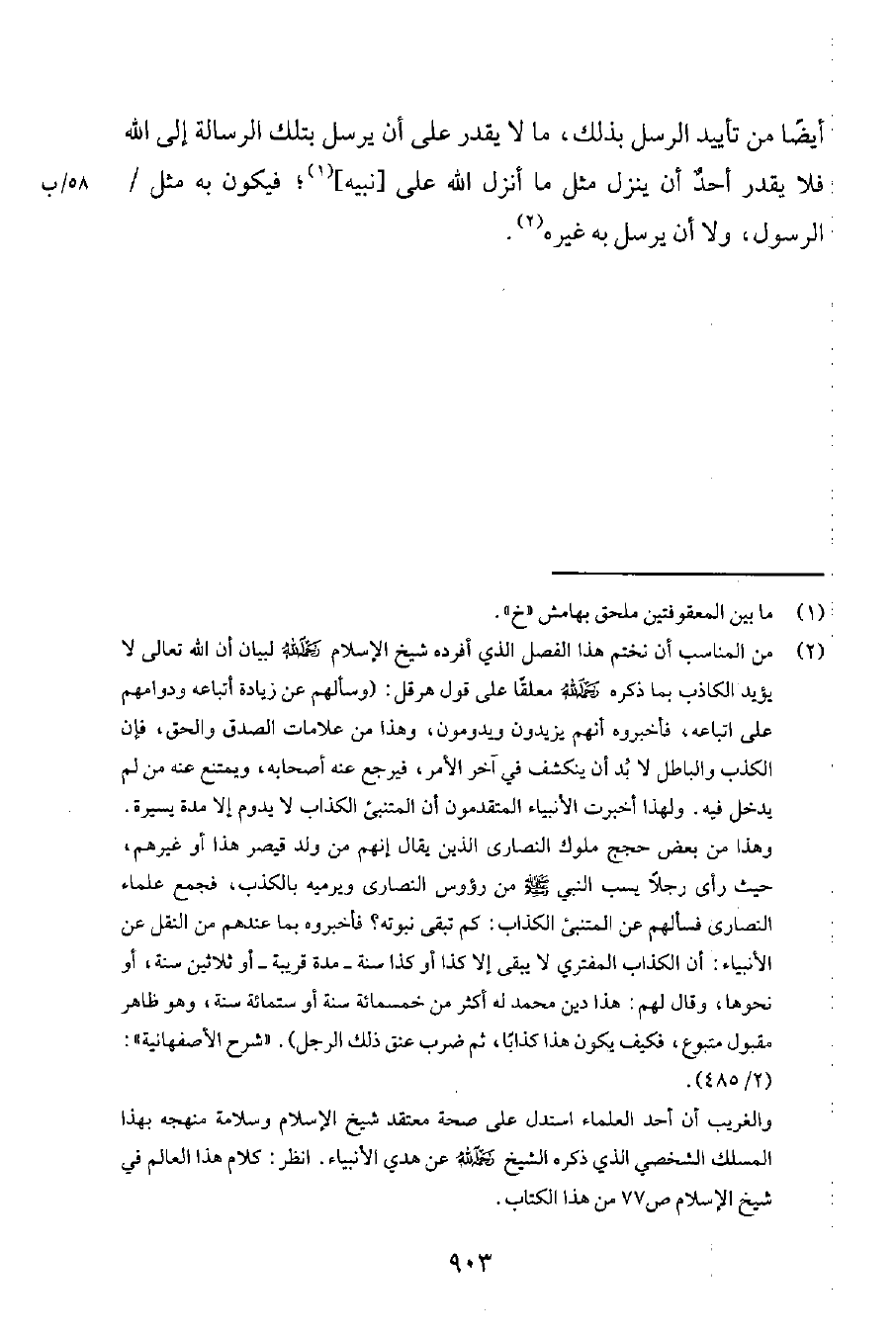 2 من المناسب أن نختم هذا الفصل الذي أفرده شيخ الإسلام رحمه الله لبيان أنّ الله تعالى لا يؤيد الكاذب بما ذكره رحمه الله معلقاً على قول هرقل: "وسألهم عن زيادة أتباعه ودوامهم على اتّباعه، فأخبروه أنهم يزيدون ويدومون، وهذا من علامات الصدق والحق، فإن الكذب والباطل لا بد أن ينكشف في آخر الأمر، فيرجع عنه أصحابه، ويمتنع عنه من لم يدخل فيه. ولهذا أخبرت الأنبياء المتقدمون أن المتنبئ الكذاب لا يدوم إلا مدة يسيرة. وهذا من بعض حجج ملوك النصارى الذين يقال إنهم من ولد قيصر هذا أو غيرهم، حيث رأى رجلاً يسب النبي صلى الله عليه وسلم من رؤوس النصارى ويرميه بالكذب، فجمع علماء النصارى فسألهم عن المتنبئ الكذاب: كم تبقى نبوته؟ فأخبروه بما عندهم من النقل عن الأنبياء: أن الكذاب المفتري لا يبقى إلا كذا أو كذا سنة - مدة قريبة، أو ثلاثين سنة، أو نحوها، وقال لهم: هذا دين محمد له أكثر من خمسمائة سنة أو ستمائة سنة، وهو ظاهر مقبول متبوع، فكيف يكون هذا كذاباً. ثم ضرب عنق ذلك الرجل". شرح الأصفهانية 2485.