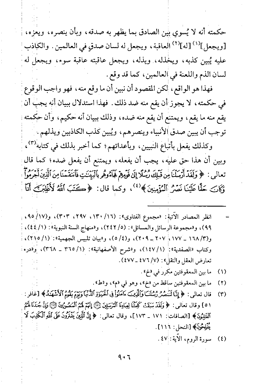 وكذلك يفعل باتباع النبيين، وبأعدائهم؛ كما أخبر بذلك في كتابه3، وبيّن أنّ هذا حقّ عليه، يجب أن يفعله، ويمتنع أن يفعل ضدّه؛ كما قال تعالى: {وَلَقَدْ أَرْسَلْنَا مِنْ قَبْلِكَ رُسُلاً إِلَى قَوْمِهِمْ فَجَاؤُوهُمْ بِالبَيِّنَات فَانْتَقَمْنَا مِنَ الَّذِينَ أَجْرَمُوا وَكَانَ حَقَّاً عَلَيْنَا نَصْرُ المُؤْمِنِينَ} 4، وكما قال: {كَتَبَ اللهُ لأَغْلِبَنَّ أَنَا