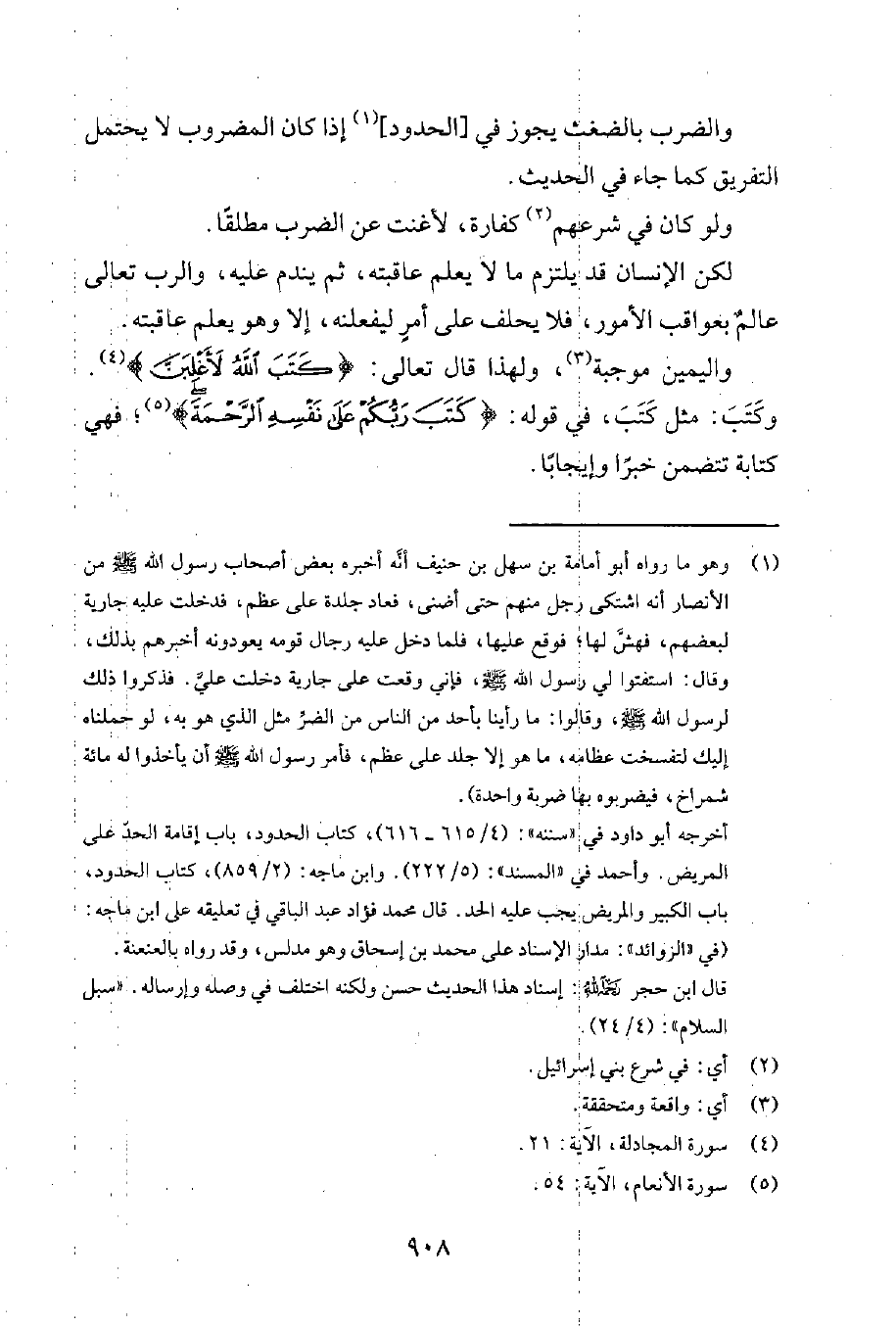 2 وهو ما رواه أبو أمامة بن سهل بن حنيف أنّه أخبره بعض أصحاب رسول الله صلى الله عليه وسلم من الأنصار أنه اشتكى رجل منهم حتى أضنى، فعاد جلدة على عظم. فدخلت عليه جارية لبعضهم، فهشّ لها، فوقع عليها، فلما دخل عليه رجال قومه يعودونه أخبرهم بذلك، وقال: استفتوا لي رسول الله صلى الله عليه وسلم، فإني وقعت على جارية دخلت عليّ. فذكروا ذلك لرسول الله صلى الله عليه وسلم، وقالوا: ما رأينا بأحد من الناس من الضرّ مثل الذي هو به، لو حملناه إليك لتفسخت عظامه، ما هو إلا جلد على عظم. فأمر رسول الله صلى الله عليه وسلم أن يأخذوا له مائة شمراخ، فيضربوه بها ضربة واحدة". أخرجه أبو داود في سننه 4615-616، كتاب الحدود، باب إقامة الحدّ على المريض. وأحمد في المسند 5222. وابن ماجه في سننه 2859، كتاب الحدود، باب الكبير والمريض يجب عليه الحدّ. وقال محمد فؤاد عبد الباقي في تعليقه على ابن ماجه: "في الزوائد: مدار الإسناد على محمد بن إسحاق وهو مدلّس. وقد رواه بالعنعنة". وقال ابن حجر رحمه الله: "إسناد هذا الحديث حسن، ولكنه اختلف في وصله وإرساله". سبل السلام 424.