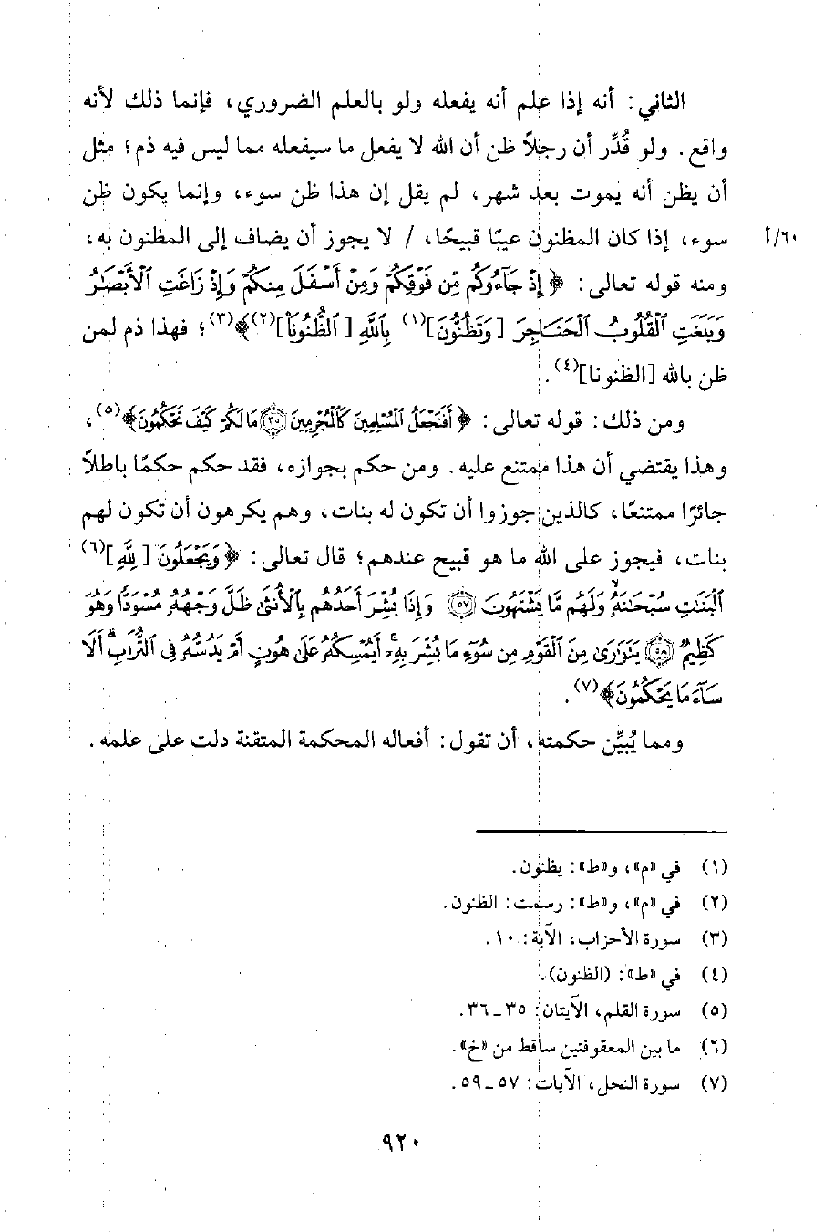 الثاني: أنه إذا علم أنّه يفعله ولو بالعلم الضروري، فإنّما ذلك لأنه واقع. ولو قُدِّر أنّ رجلاً ظنّ أنّ الله لا يفعل ما سيفعله ممّا ليس فيه ذم؛ مثل أن يظنّ أنّه يموت بعد شهر، لم يقل إنّ هذا ظنّ سوء، وإنّما يكون ظنّ سوء، إذا كان المظنون عيباً قبيحاً، لا يجوز أن يضاف إلى المظنون به، ومنه قوله تعالى: {إِذْ جَاءُوكُمْ مِنْ فَوقِكُمْ وَمِنْ أَسْفَلَ مِنْكُمْ وَإِذْ زَاغَت الأَبْصَارُ وَبَلَغَت القُلُوبُ الحَنَاجِر وَ [تَظُنُّونَ] 1 بِاللهِ [الظُّنُونَا] 2} 3؛ فهذا ذمّ لمن ظنّ بالله [الظنونا] 4