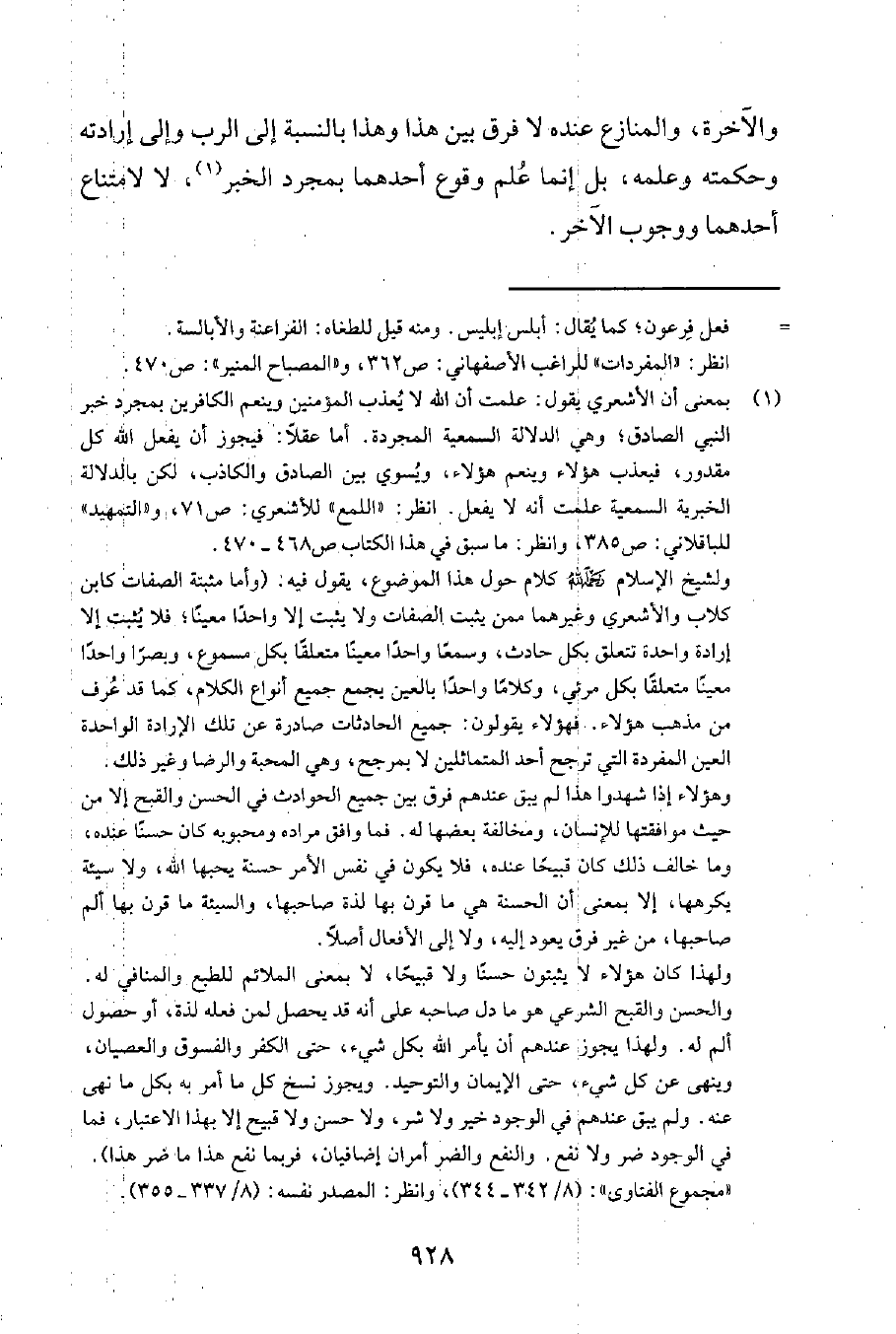 ولهذا كان هؤلاء لا يثبتون حسناً ولا قبيحاً، لا بمعنى الملائم للطبع والمنافي له. والحسن والقبح الشرعي هو ما دلّ صاحبه على أنه قد يحصل لمن فعله لذة، أو حصول ألم له. ولهذا يجوز عندهم أن يأمر الله بكل شيء، حتى الكفر والفسوق والعصيان، وينهى عن كلّ شيء، حتى الإيمان والتوحيد. ويجوز نسخ كل ما أمر به بكل ما نهى عنه. ولم يبق عندهم في الوجود خير ولا شر، ولا حسن ولا قبيح إلا بهذا الاعتبار، فما في الوجود ضر ولا نفع. والنفع والضر أمران إضافيان، فربما نفع هذا ما ضرّ هذا". مجموع الفتاوى 8342-344. وانظر: المصدر نفسه 8337-355.