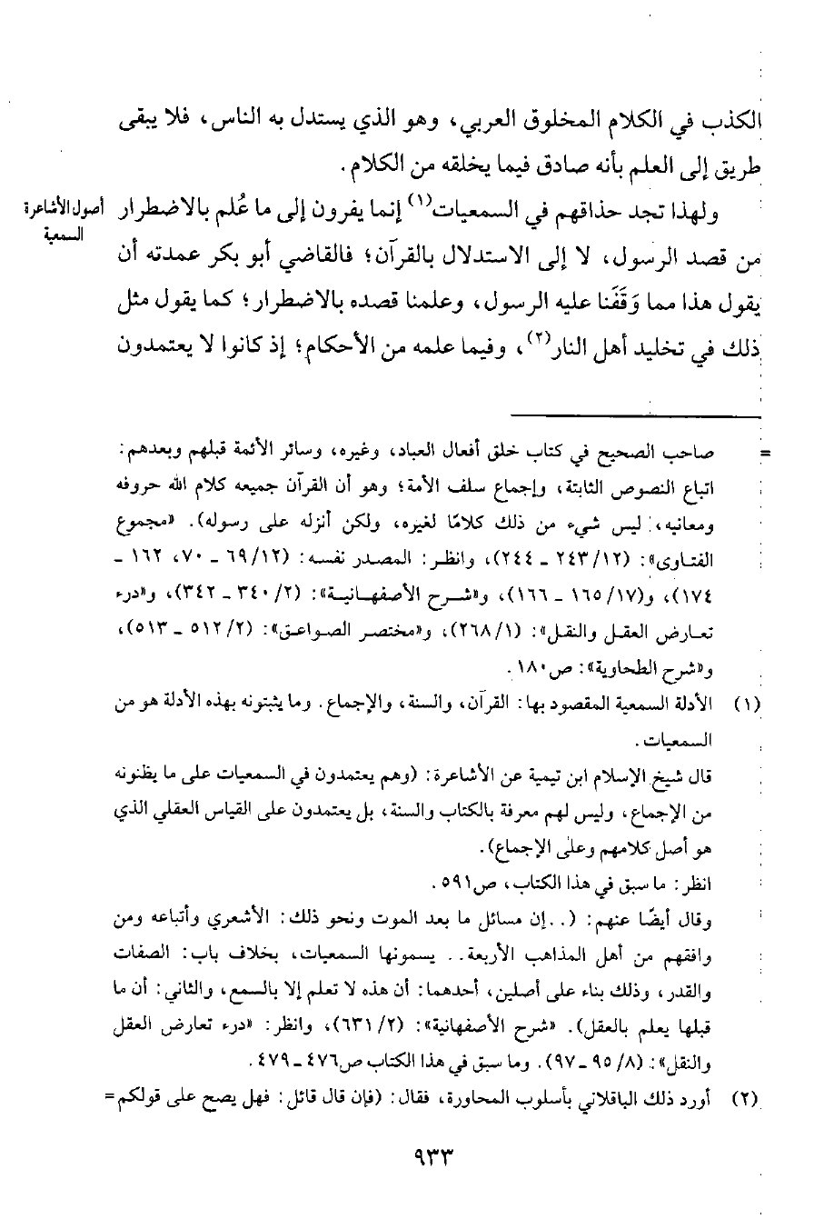 وقال أيضاً عنهم: ".. إن مسائل ما بعد الموت ونحو ذلك: الأشعري وأتباعه ومن وافقهم من أهل المذاهب الأربعة.. يسمونها السمعيات، بخلاف باب الصفات والقدر، وذلك بناء على أصلين، أحدهما: أن هذه لا تعلم إلا بالسمع، والثاني: أن ما قبلها يعلم بالعقل". شرح الأصفهانية 2631 وانظر: درء تعارض العقل والنقل 895-97. وما سبق في هذا الكتاب ص 574-578.