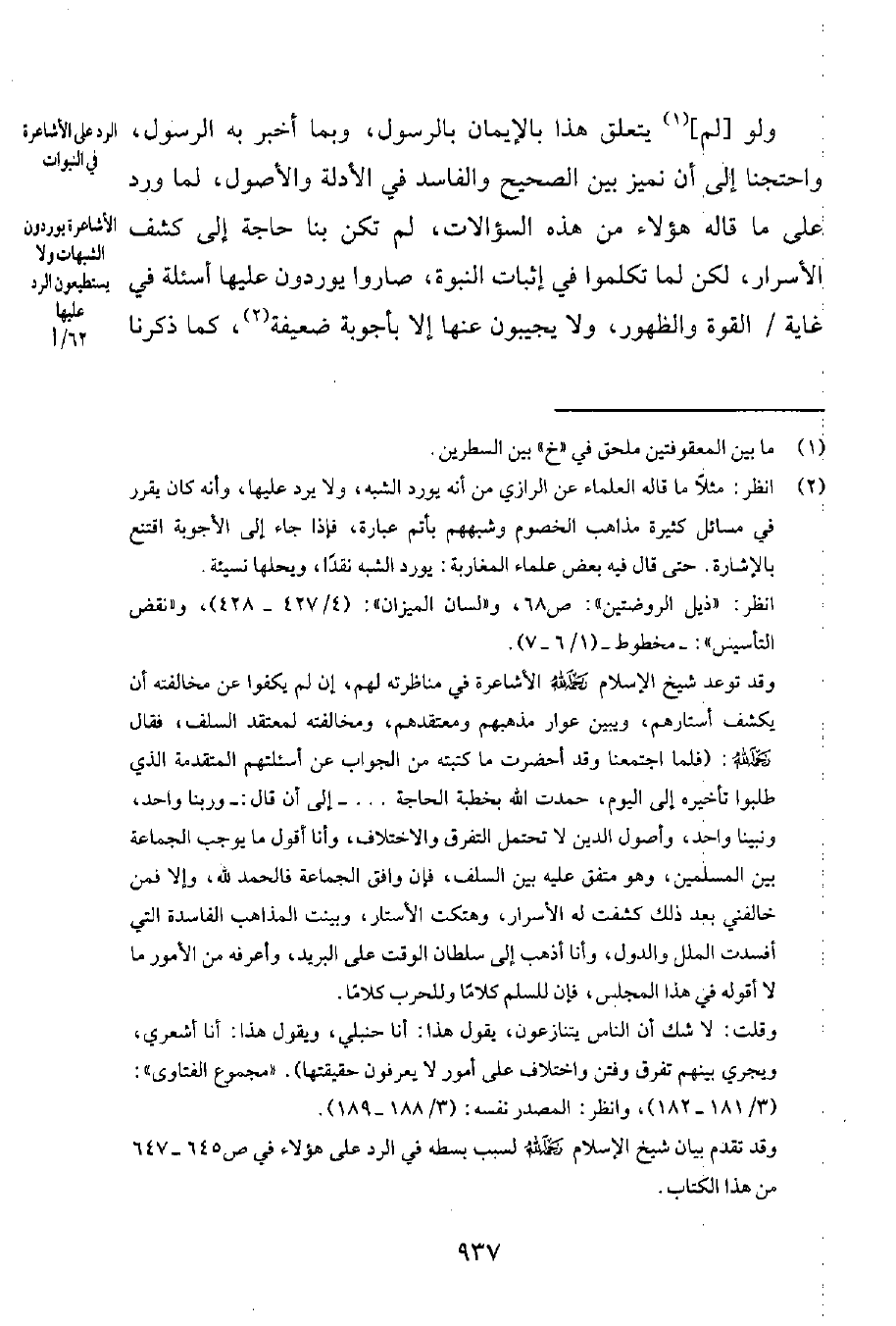 2 انظر مثلاً ما قاله العلماء عن الرازي من أنه يورد الشبه، ولا يرد عليها، وأنه كان يقرر في مسائل كثيرة مذاهب الخصوم وشبههم بأتم عبارة، فإذا جاء إلى الأجوبة اقتنع بالإشارة. حتى قال فيه بعض علماء المغاربة: يورد الشبه نقداً، ويحلّها نسيئة.