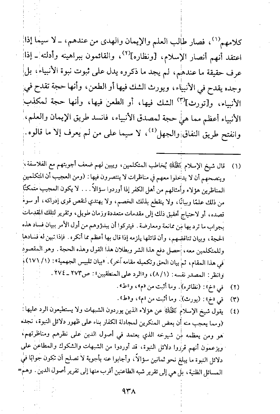 1 قال شيخ الإسلام رحمه الله يُخاطب المتكلمين، ويبين لهم ضعف أجوبتهم مع الفلاسفة، وينصحهم أن لا يدخلوا معهم في مناظرات لا ينتصرون فيها: "ومن العجيب أنّ المتكلمين المناظرين لهؤلاء وأمثالهم من أهل الكفر إذا أوردوا سؤالاً ... لا يكون المجيب متمكناً من ذلك علماً وبياناً، ولا ينقطع بذلك الخصم، ولا يهتدي لنقص قوى إدراكه، أو سوء قصده، أو لاحتياج تحقيق ذلك إلى مقدمات متعددة وزمان طويل، وتقرير لتلك المقدمات بجواب ما ترد بها من ممانعة ومعارضة. فيتركوا أن يبدؤوهم من أول الأمر ببيان فساد هذه الحجة، وبيان تناقضهم، وأن قائلها يلزمه إذا قال بها أعظم مما أنكره. فإذا تبين له فسادها وللمتكلمين معه، حصل دفع هذا الشر وبطلان هذا القول وهذه الحجة. وهو المقصود في هذا المقام، ثم بيان الحق وتكميله مقامه آخر". بيان تلبيس الجهمية 1171. وانظر: المصدر نفسه 18. والرد على المنطقيين ص 273-274.