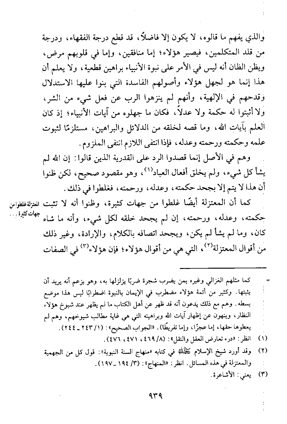 كما أنّ المعتزلة أيضاً غلطوا من جهات كثيرة، وظنّوا أنه لا تثبت حكمته، وعدله، ورحمته، إن لم يجحد خلقه لكل شيء، وأنه ما شاء كان، وما لم يشأ لم يكن، ويجحد اتصافه بالكلام، والإرادة، وغير ذلك من أقوال المعتزلة2، التي هي من أقوال هؤلاء؛ فإن هؤلاء3 في الصفات