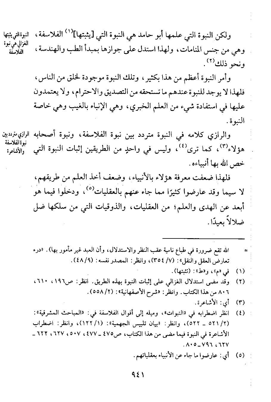4 انظر اضطرابه في النبوات، وميله إلى أقوال الفلاسفة في: المباحث المشرقية 2521-522. وانظر: بيان تلبيس الجهمية 1122. وانظر اضطراب الأشاعرة في النبوة فيما مضى من هذا الكتاب، ص 573-576، 612، 747-753، 954-965.