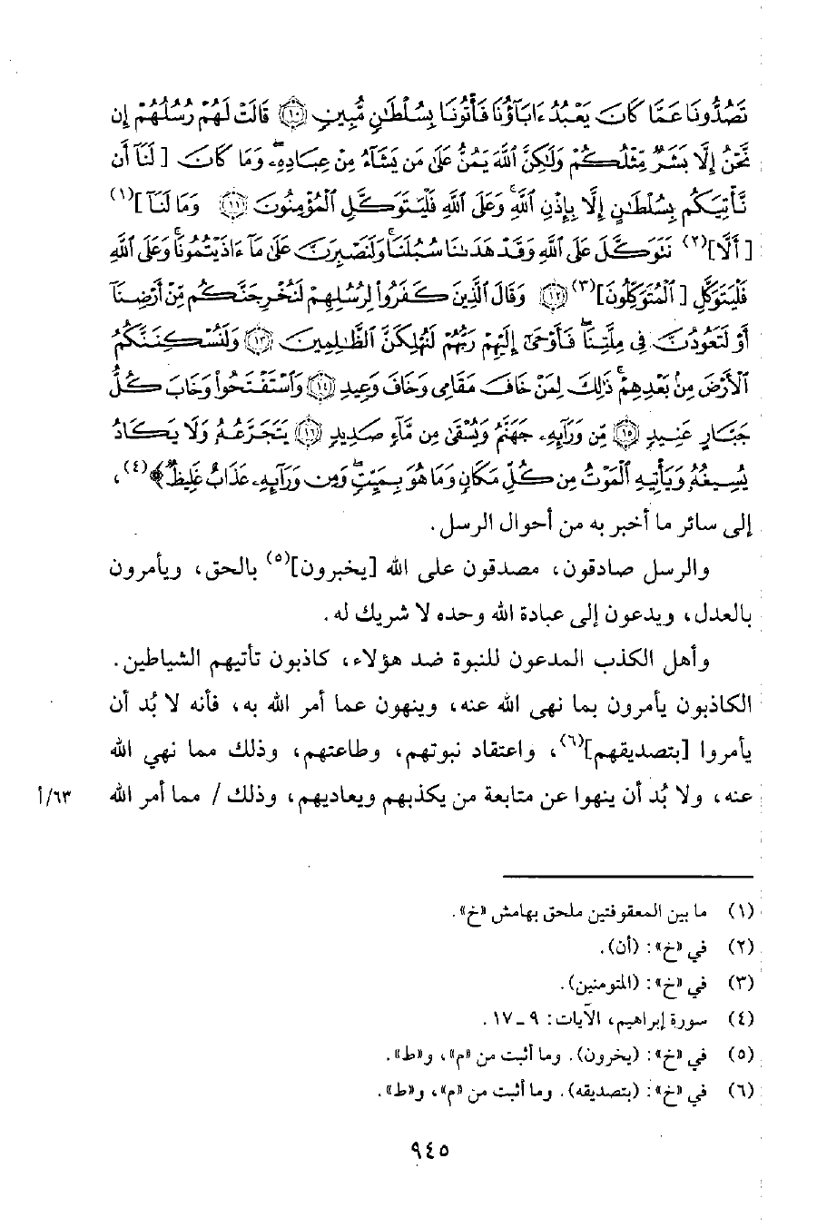 تَصُدُّونَا عَمَّا كَانَ يَعْبُدُ آباؤُنا فَأْتُونَا بِسُلْطَانٍ مُبِين قَالَتْ لَهُمْ رُسُلُهُمْ إِنْ نَحْنُ إِلاَّ بَشَرٌ مِثْلُكُمْ وَلَكِنَّ اللهَ يَمُنُّ عَلَى مَنْ يَشَاءُ مِنْ عِبَادِهِ وَمَا كَانَ [لَنَا أَنْ نَأْتِيَكُمْ بِسُلْطَانٍ إِلاَّ بِإِذْنِ اللهِ وَعَلَى اللهِ فَلْيَتَوَكَّل المُؤمِنُون وَمَا لَنَا] 1 [أَلاَّ] 2 نَتَوَكَّلَ عَلَى اللهِ وَقَدْ هَدَانَا سُبُلَنَا وَلَنَصْبِرَنَّ عَلَى مَا آذَيْتُمُونَا وَعَلَى اللهِ فَلْيَتَوَكَّل [المُتَوَكِّلُون] 3 وَقَالَ الَّذِينَ كَفَرُوا لِرُسُلِهِمْ لَنُخْرِجَنَّكُمْ مِنْ أَرْضِنَا أَوْ لَتَعُودُنَّ في مِلَّتِنَا فَأَوْحَى إِلَيْهِمْ رَبُّهُم لَنُهْلِكَنَّ الظَّالِمِينَ وَلَنُسْكِنَنَّكُمُ الأرْضَ مِنْ بَعْدِهِمْ ذَلِكَ لِمَنْ خافَ مَقَامِي وَخَافَ وَعِيد وَاسْتَفْتَحُوا وَخَابَ كُلُّ جَبَّارٍ عَنِيدٍ مِنْ وَرَائِهِ جَهَنَّمُ وَيُسْقَى مِنْ مَاءٍ صَدِيدٍ يَتَجَرَّعُهُ وَلا يَكادُ يُسِيغُهُ وَيَأْتِيهِ المَوْتُ مِنْ كُلِّ مَكَانٍ وَمَا هُوَ بِمَيِّتٍ وَمَنْ وَرَائِهِ عَذَابٌ غَلِيظٌ} 4، إلى سائر ما أخبر به من أحوال الرسل.