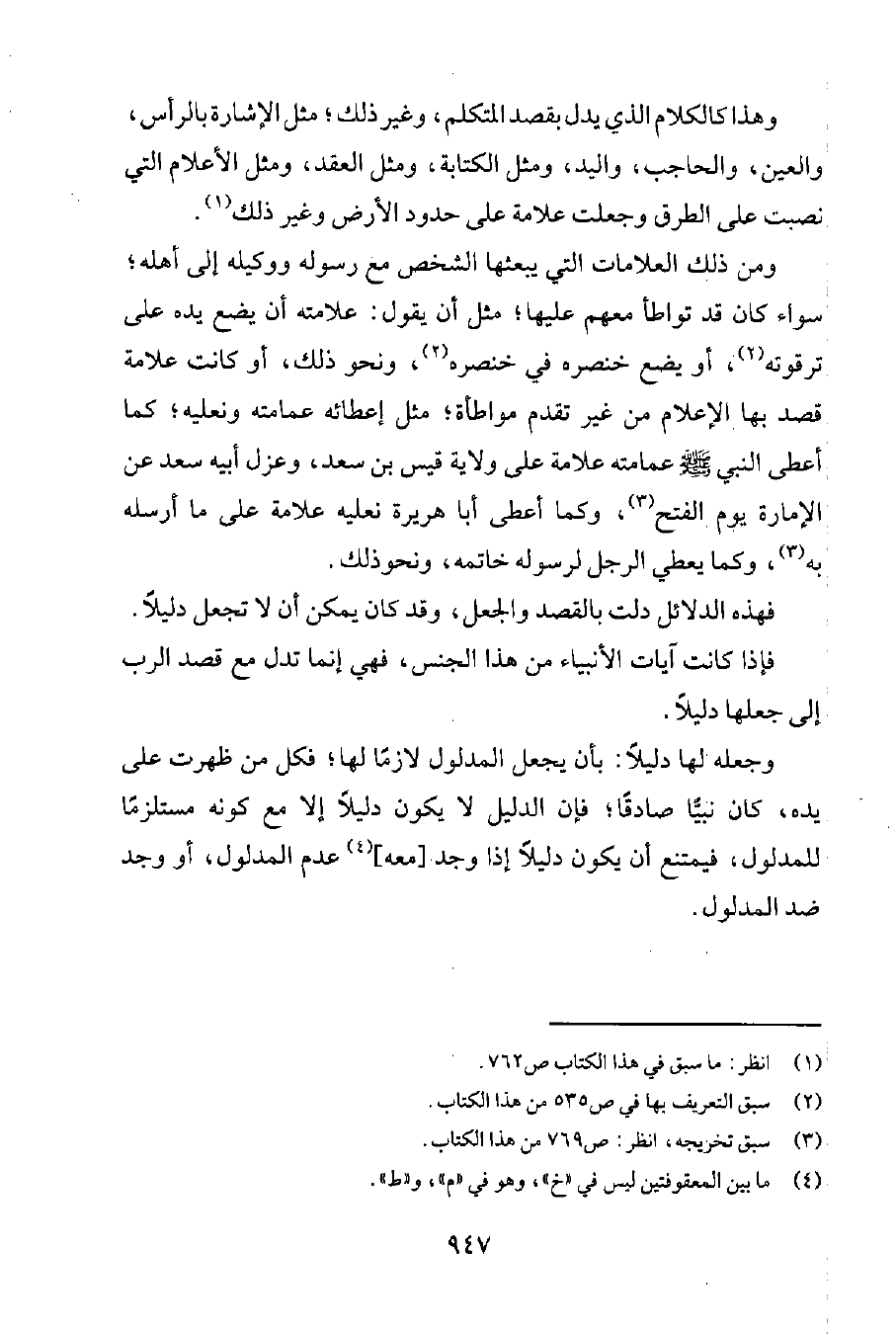 وهذا كالكلام الذي يدلّ بقصد المتكلم، وغير ذلك؛ مثل الإشارة بالرأس، والعين، والحاجب، واليد؛ ومثل الكتابة؛ ومثل العقد؛ ومثل الأعلام التي نصبت على الطرق، وجعلت علامة على حدود الأرض وغير ذلك1.