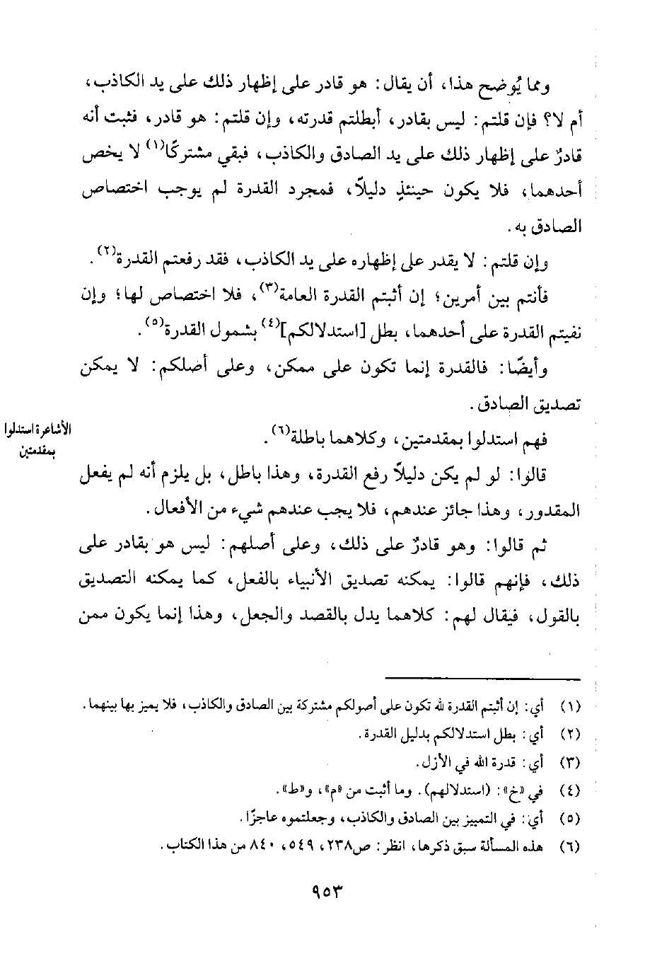 وممّا يُوضّح هذا، أن يقال: هو قادر على إظهار ذلك على يد الكاذب، أم لا؟ فإن قلتم: ليس بقادر، أبطلتم قدرته، وإن قلتم: هو قادر، فثبت أنه قادرٌ على إظهار ذلك على يد الصادق والكاذب، فبقي مشتركاً1 لا يخصّ أحدهما، فلا يكون حينئذٍ دليلاً، فمجرّد القدرة لم يوجب اختصاص الصادق به.