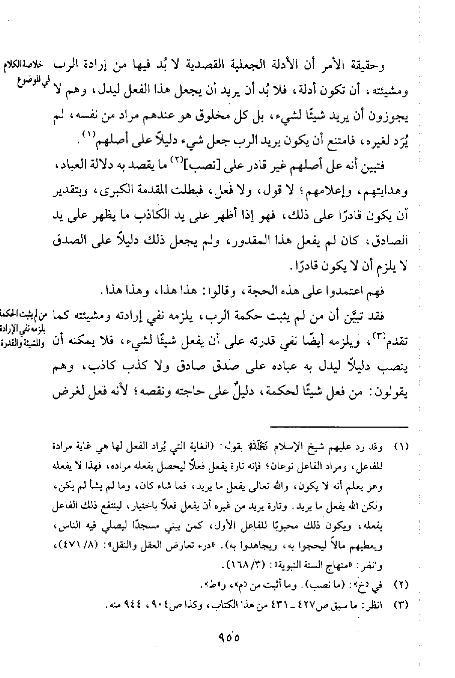 1 وقد ردّ عليهم شيخ الإسلام رحمه الله بقوله: "الغاية التي يُراد الفعل لها هي غاية مرادة للفاعل، ومراد الفاعل نوعان؛ فإنه تارة يفعل فعلاً ليحصل بفعله مراده، فهذا لا يفعله وهو يعلم أنه لا يكون، والله تعالى يفعل ما يريد، فما شاء كان، وما لم يشأ لم يكن، ولكن الله يفعل ما يريد. وتارة يريد من غيره أن يفعل فعلاً باختيار، لينتفع ذلك الفاعل بفعله، ويكون ذلك محبوباً للفاعل الأول، كمن يبني مسجداً ليصلي فيه الناس، ويعطيهم مالاً ليحجوا به، ويجاهدوا به". درء تعارض العقل والنقل 8471. وانظر: منهاج السنة النبوية 3168.