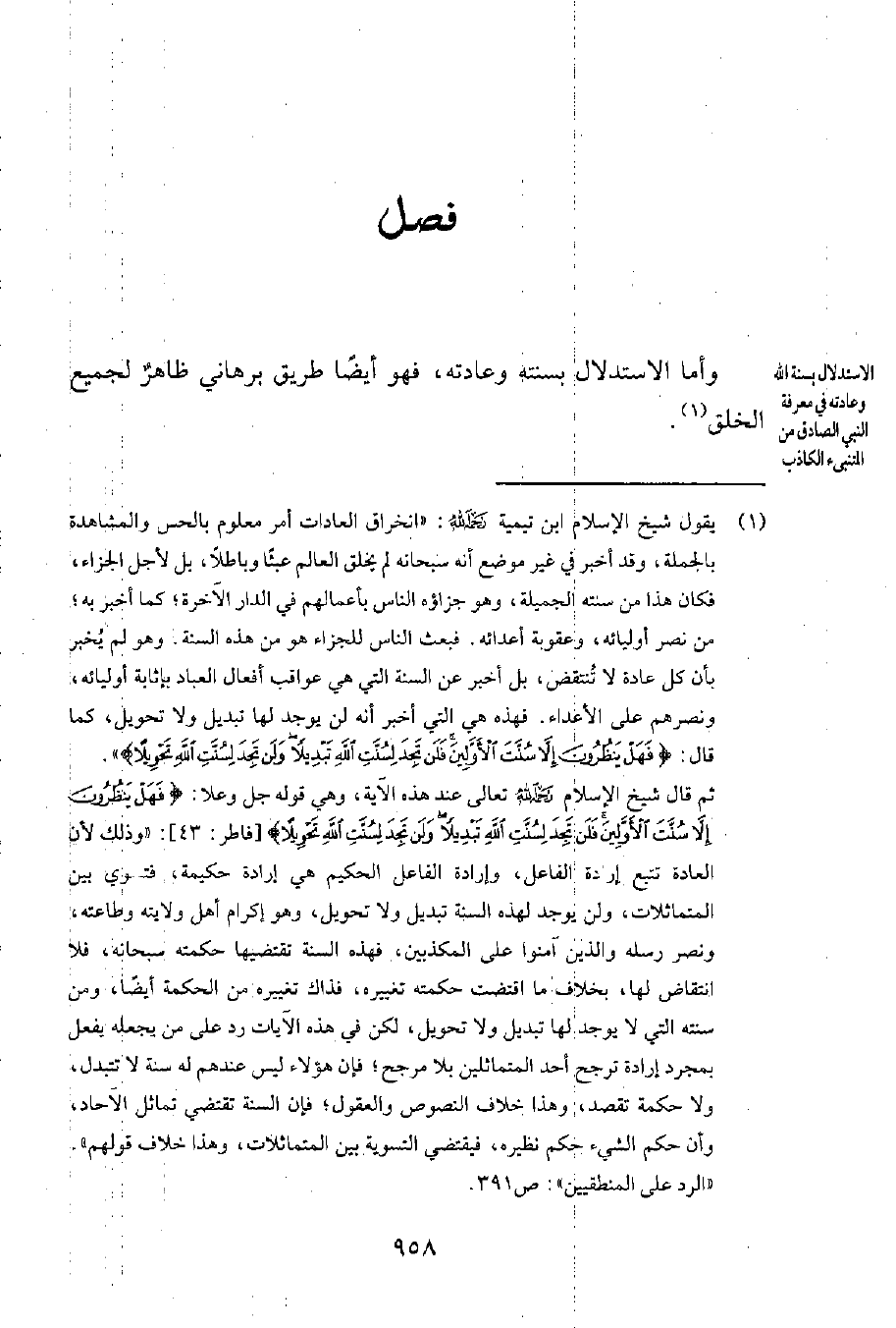 ثمّ قال شيخ الإسلام رحمه الله تعالى عند هذه الآية، وهي قوله جل وعلا: {فَهَلْ يَنْظُرُونَ إِلَّا سُنَّتَ الْأَوَّلِينَ فَلَنْ تَجِدَ لِسُنَّتِ اللَّهِ تَبْدِيلاً وَلَنْ تَجِدَ لِسُنَّتِ اللَّهِ تَحْوِيلاً} [سورة فاطر، الآية 43] : (وذلك لأنّ العادة تتبع إرادة الفاعل، وإرادة الفاعل الحكيم هي إرادة حكيمة، فتسوي بين المتماثلات، ولن يوجد لهذه السنة تبديل ولا تحويل، وهو إكرام أهل ولايته وطاعته، ونصر رسله والذين آمنوا على المكذبين. فهذه السنة تقتضيها حكمته سبحانه، فلا انتقاض لها، بخلاف ما اقتضت حكمته تغييره، فذاك تغييره من الحكمة أيضاً، ومن سنته التي لا يوجد لها تبديل ولا تحويل، لكن في هذه الآيات ردّ على من يجعله يفعل بمجرد إرادة ترجح أحد المتماثلين بلا مرجّح؛ فإنّ هؤلاء ليس عندهم له سنة لا تتبدّل، ولا حكمة تقصد، وهذا خلاف النصوص والعقول؛ فإنّ السنة تقتضي تماثل الآحاد، وأنّ حكم الشيء حكم نظيره، فيقتضي التسوية بين المتماثلات، وهذا خلاف قولهم) . الرد على المنطقيين ص 391.