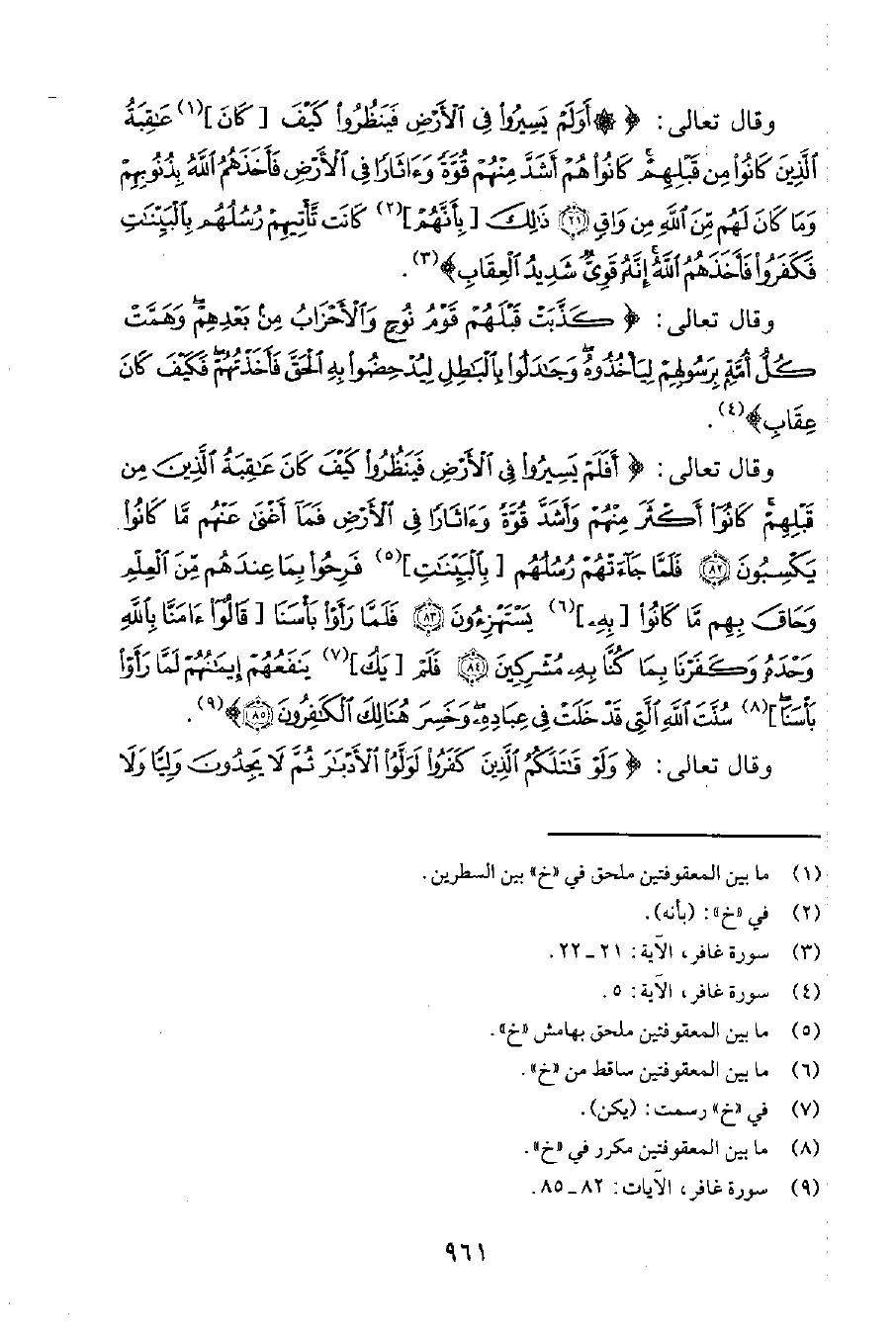 وقال تعالى: {أَفَلَمْ يَسِيرُوا في الأَرْضِ فَيَنْظُرُوا كَيْفَ كَانَ عَاقِبَةُ الَّذِينَ مِنْ قَبْلِهِمْ كَانُوا أَكْثَرَ مِنْهُمْ وَأَشَدَّ قُوَّةً وَآثارَاً في الأَرْضِ فَمَا أَغْنَى عَنْهُمْ مَا كَانُوا يَكْسِبُون فَلَمَّا جَاءَتْهُمْ رُسُلُهُمْ [بِالبَيِّنَاتِ] 5 فَرِحُوا بِمَا عِنْدَهُمْ مِنَ العِلْمِ وَحَاقَ بِهِمْ مَا كَانُوا [بِهِ] 6 يَسْتَهْزِئُونَ فَلَمَّا رَأَوْا بَأْسَنَا [قَالُوا آمَنَّا بِاللهِ وَحْدَهُ وَكَفَرْنَا بِمَا كُنَّا بِهِ مُشْرِكِينَ فَلَمْ [يَكُ] 7 يَنْفَعُهُمْ إِيْمَانُهُمْ لَمَّا رَأَوْا بَأْسَنَا] 8 سُنَّةَ اللهِ الَّتِي قَدْ خَلَتْ في عِبَادِهِ وَخَسِرَ هُنَالِكَ الكَافِرُون} 9.