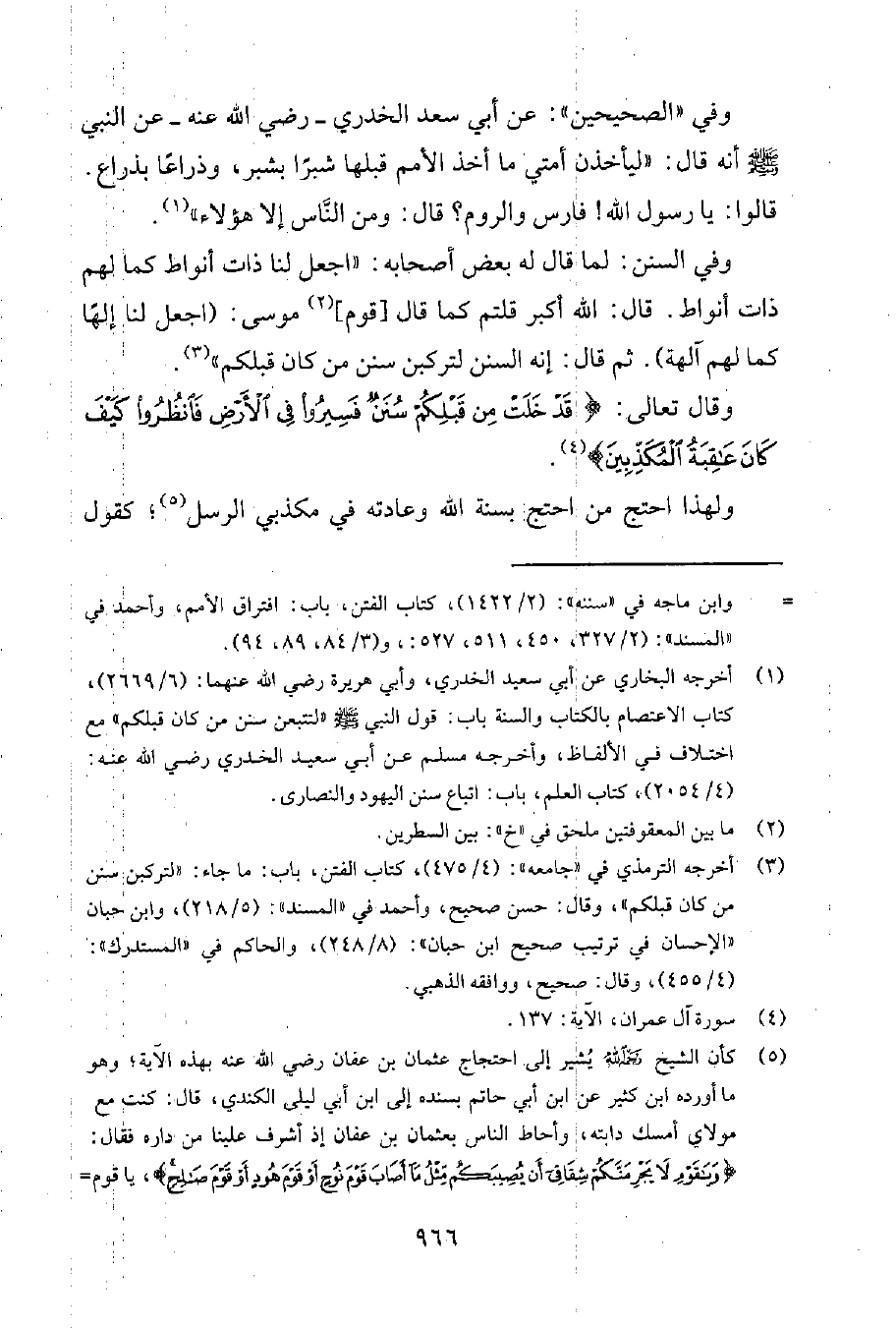 1 أخرجه البخاري عن أبي سعيد الخدري، وأبي هريرة رضي الله عنهما، 62669، كتاب الاعتصام بالكتاب والسنة، باب قول النبي صلى الله عليه وسلم: "لتتبعن سنن من كان قبلكم"، مع اختلاف في الألفاظ.