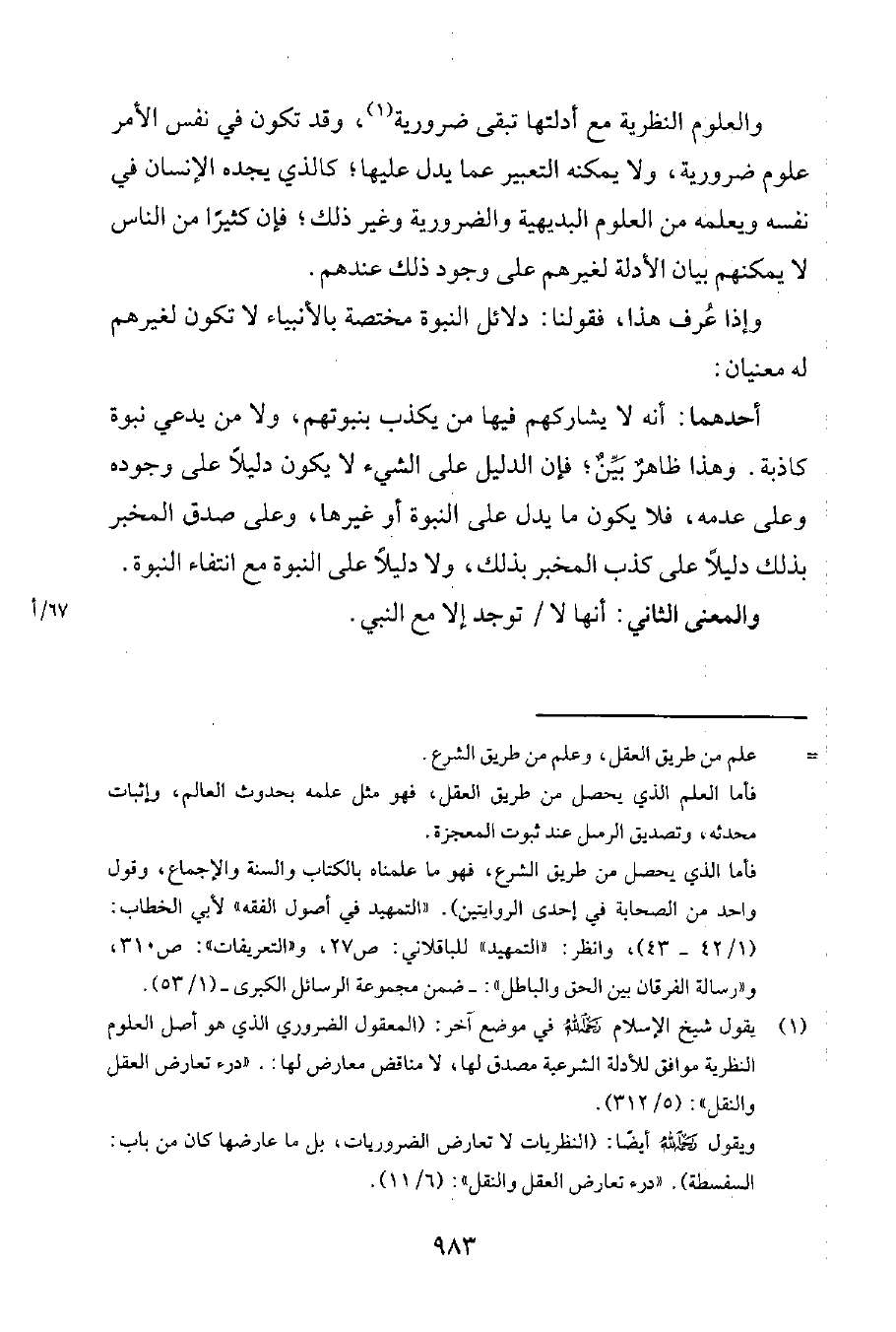 1 يقول شيخ الإسلام رحمه الله في موضع آخر: "المعقول الضروري الذي هو أصل العلوم النظرية موافق للأدلة الشرعية مصدق لها، لا مناقض معارض لها". درء تعارض العقل والنقل 5312.