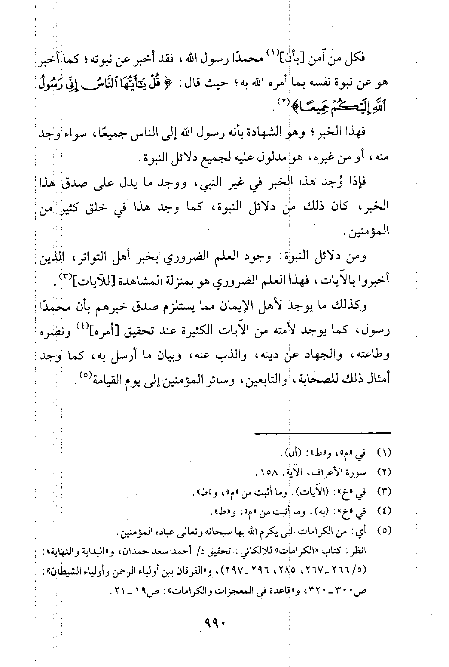 وكذلك ما يوجد لأهل الإيمان مما يستلزم صدق خبرهم بأنّ محمّداً رسول، كما يوجد لأمته من الآيات الكثيرة عند تحقيق [أمره] 4 ونصره وطاعته، والجهاد عن دينه، والذبّ عنه، وبيان ما أرسل به، كما وجد أمثال ذلك للصحابة، والتابعين، وسائر المؤمنين إلى يوم القيامة5.