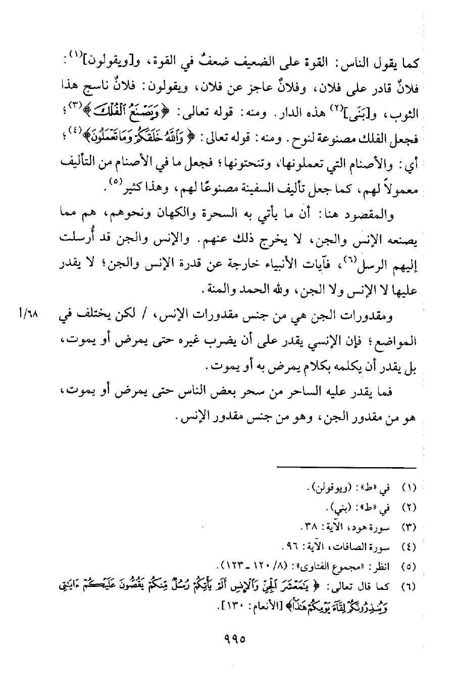 والمقصود هنا: أنّ ما يأتي به السحرة والكهان ونحوهم، هو ممّا يصنعه الإنس والجنّ، لا يخرج ذلك عنهم. والإنس والجنّ قد أُرسلت إليهم الرسل6، فآيات الأنبياء خارجة عن قدرة الإنس والجن؛ لا يقدر عليها لا الإنس ولا الجن، ولله الحمد والمنة.