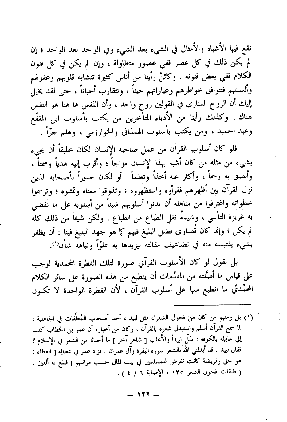 وأما إن كنت قد أوتيت حظك من معرفة فروق الكلام والمَيْز بين أساليبه فاقرأ ما شئت من خطب العرب وأشعارها، وحكمها وأمثالها، ورسائلها ومحاوراتها، متتبعًا في ذلك عصور الجاهلية والإسلام على اختلاف طبقاتها، ثم افتح صفحة من هذا الكتاب العزيز وانظر ماذا ترى؟