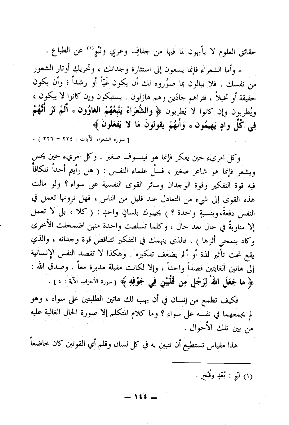 عامة من نعرفهم من الفصحاء -قدامى ومحدثين- يؤتون من هذا الجانب غالبًا، أعني جانب الإملال والإسراف، لا جانب الإخلال والإجحاف. وأكثرهم تجمع بهم شهوة البيان إلى أبعد من هذا الحد، فمنهم من يذهب إلى التكليف والتفصح باستعمال الغريب من المفردات والتراكيب، فيكلفك أن تبدي وتعيد وتقبل وتدبر حتى تهتدي إلى وجه مراده، وهكذا لا يزداد كلامه بالبسط إلا ضيقًا عن الفهم. ومنهم من يُلقي حول المعنى ركامًا من الحشو والفضول ينوء بحمله، أو يلبسه ثوبًا فضفاضًا من المترادف والمتقارب يتعثر في أذياله. يحسب أنه يوفي لك المعنى ويحدده، وفي الحق إنما ينشره ويبدده. ولعل أمثل هؤلاء طريقة من لو حذفت شطر كلامه لأغناك عنه ثاني شطريه.