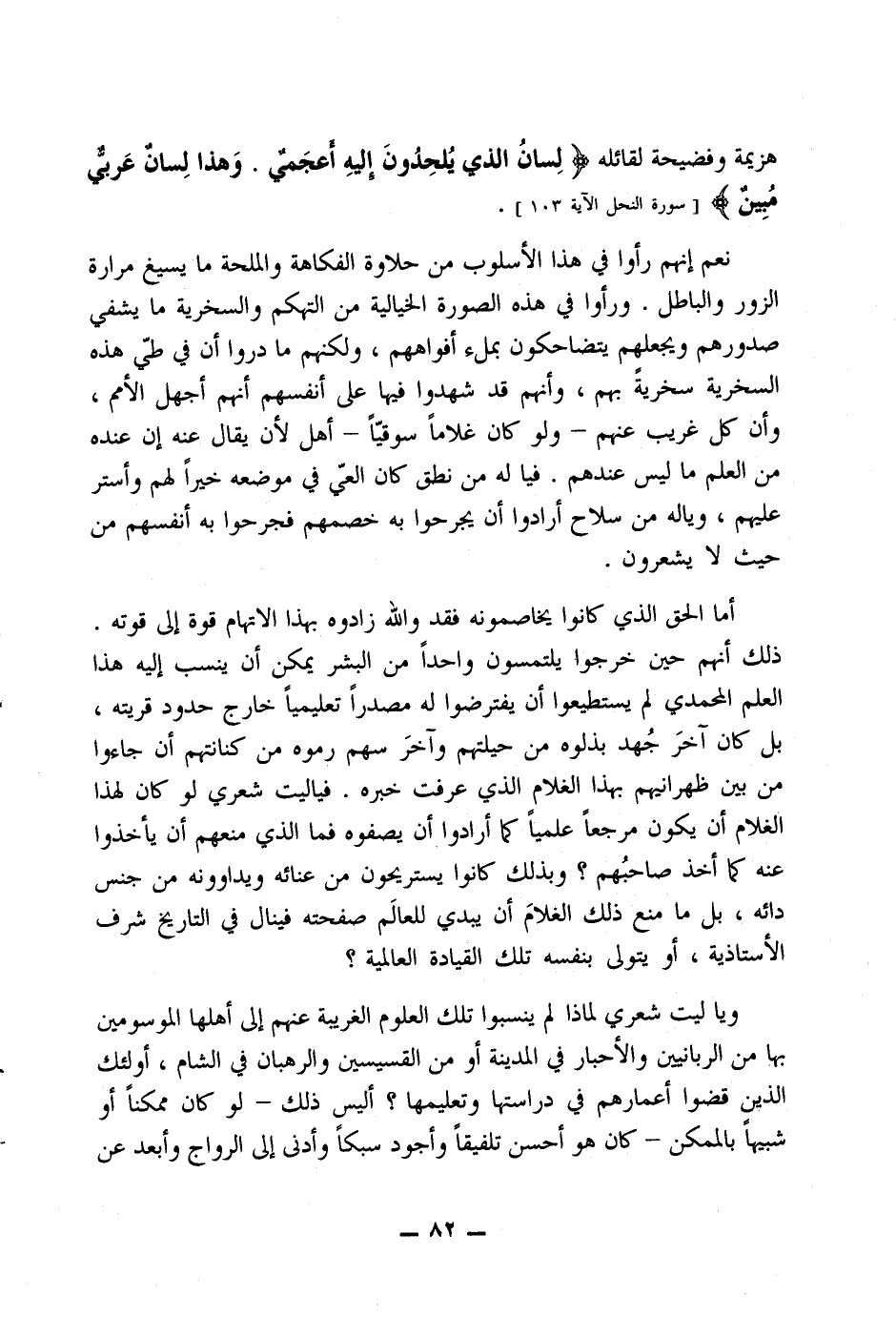 ثم اسأل نفسك بعد ذلك "أترين هذا الرجل الأمي جاء بهذا الحديث كله من عند نفسه؟ ".. تسمع منها جواب البديهة الذي لا تردد فيه "إنه لا بد أن يكون قد استقى هذه الأنباء من مصدر علمي وثيق، واعتمد فيها على اطلاع واسع ودرس دقيق. ولا يمكن أن تكون تلك الأنباء كلها وليدة عقله وثمرة ذكائه وعبقريته" وإلا فأين هذا الذكي أو العبقري الذي أعطاه الدهر عهدًا بأن يكون عاصمًا لظنونه كلها من الخطأ في كشف وقائع الماضي مهما قدم، وأنباء المستقبل مهما بعد؟