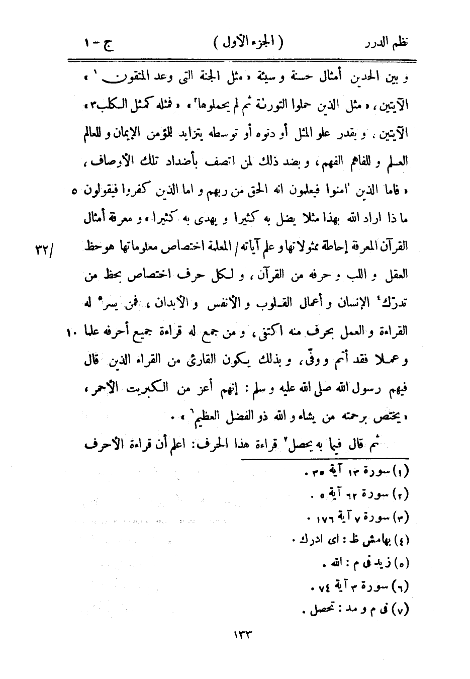وبين الحدين؛ أمثال حسنة وسيئة {مثل الجنة التي وعد المتقون} [الرعد: 35] الآيتين، {مثل الذين حملوا التوراة ثم لم يحملوها} [الجمعة: 5] {فمثله كمثل الكلب} [الأعراف: 176] الآيتين. وبقدر علو المثل أو دنوه أو توسطه يتزايد للمؤمن الإيمان وللعالم العلم وللفاهم الفهم، وبضد ذلك لمن اتصف بأضداد تلك الأوصاف، {فأما الذين آمنوا فيعلمون أنه الحق من ربهم وأما الذين كفروا فيقولون ماذا أراد الله بهذا مثلاً يضل به كثيراً ويهدي به كثيراً} ومعرفة أمثال القرآن المعرفة إحاطة ممثولاتها وعلم آياته المعلمة اختصاص معلوماتها هو حظ العقل واللب وحرفه من القرآن، ولكل حرف اختصاص بحظ من تدرّك الإنسان وأعمال القلوب والأنفس والأبدان، فمن يسر له القراءة والعمل بحرف منه اكتفى، ومن جمع له قراءة جميع أحرفه علماً وعملاً فقد أتم ووفّى، وبذلك يكون القارىء من القراء الذين قال فيهم رسول الله صَلَّى اللهُ عَلَيْهِ وَسَلَّمَ: «إنهم أعز من الكبريت الأحمر» {يختص برحمته من يشاء والله ذو الفضل العظيم} [آل عمران: 74] .