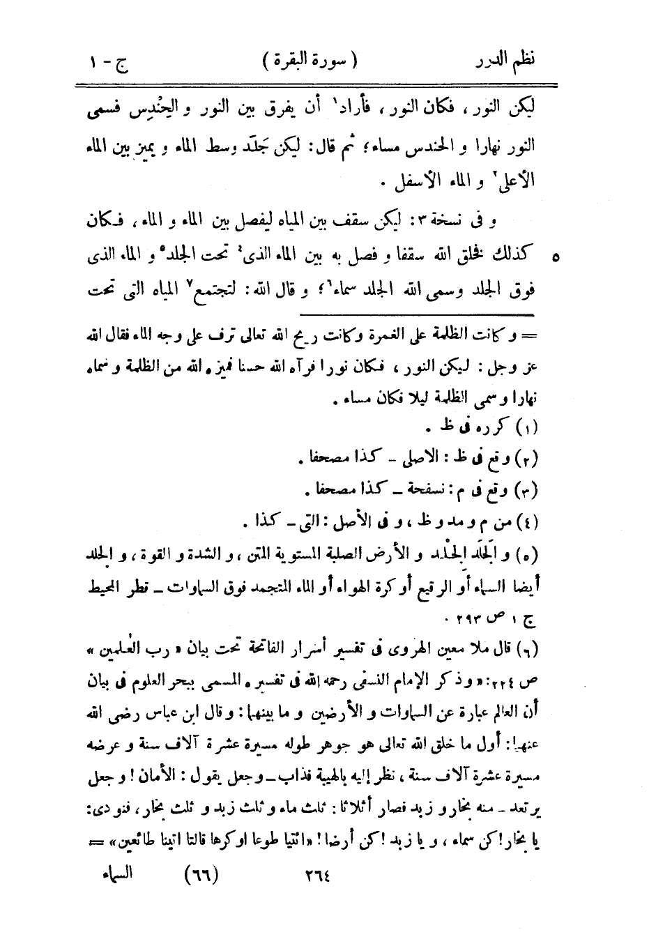 ليكن النور، فكان النور، فأراد أن يفرق بين النور والحِندِس فسمى النور نهاراً والحندس مساءً؛ ثم قال: ليكن جَلَد وسط الماء ويميز بين الماء الأعلى والماء الأسفل.